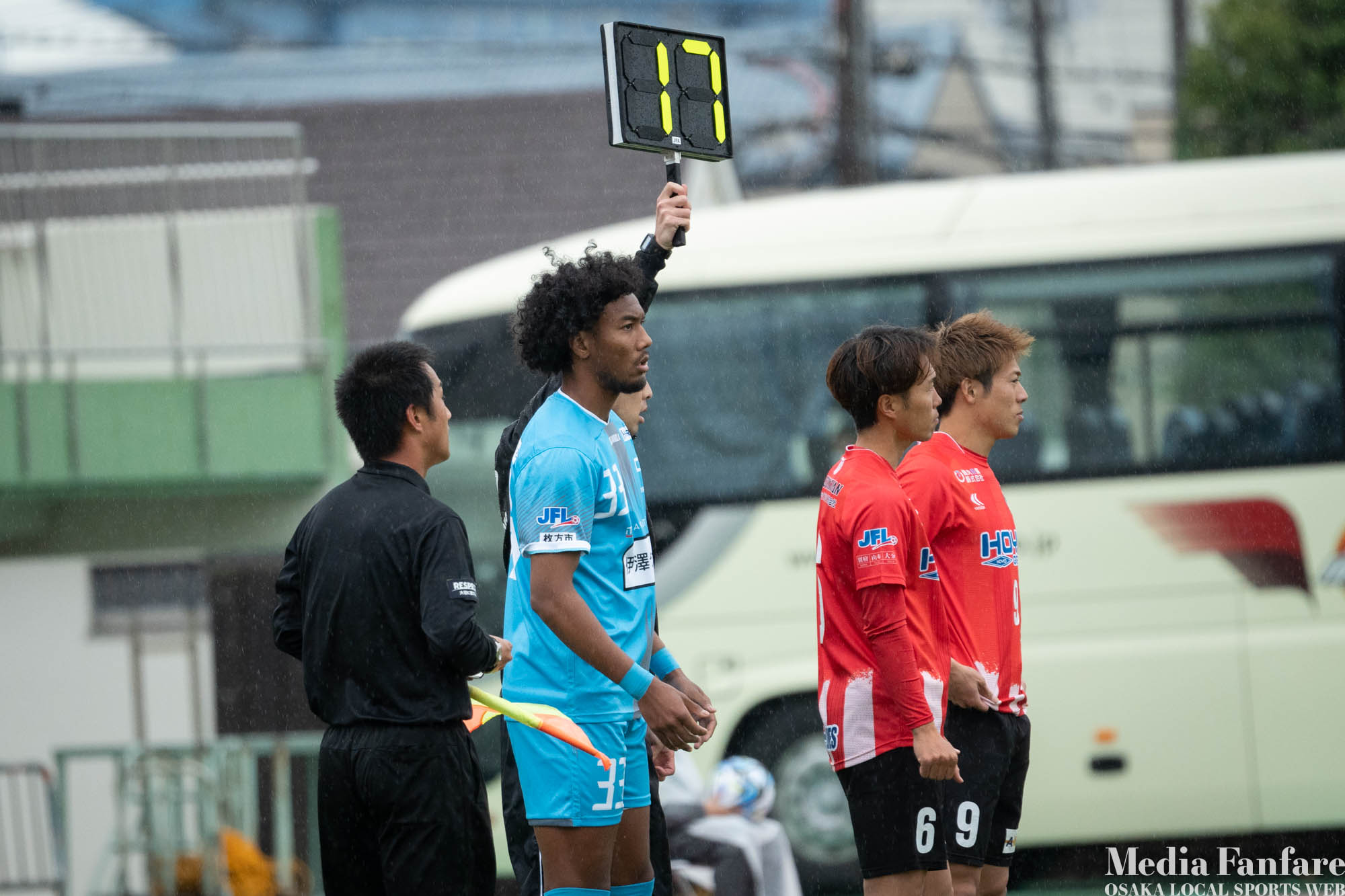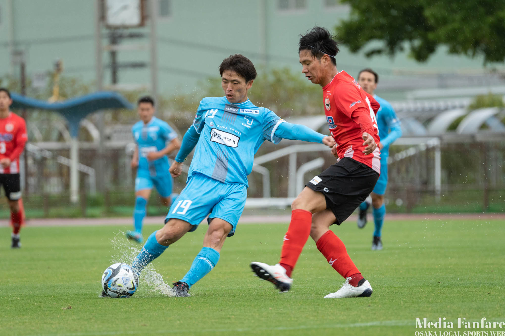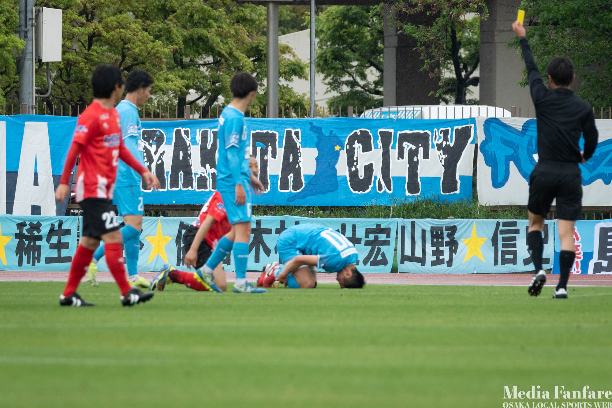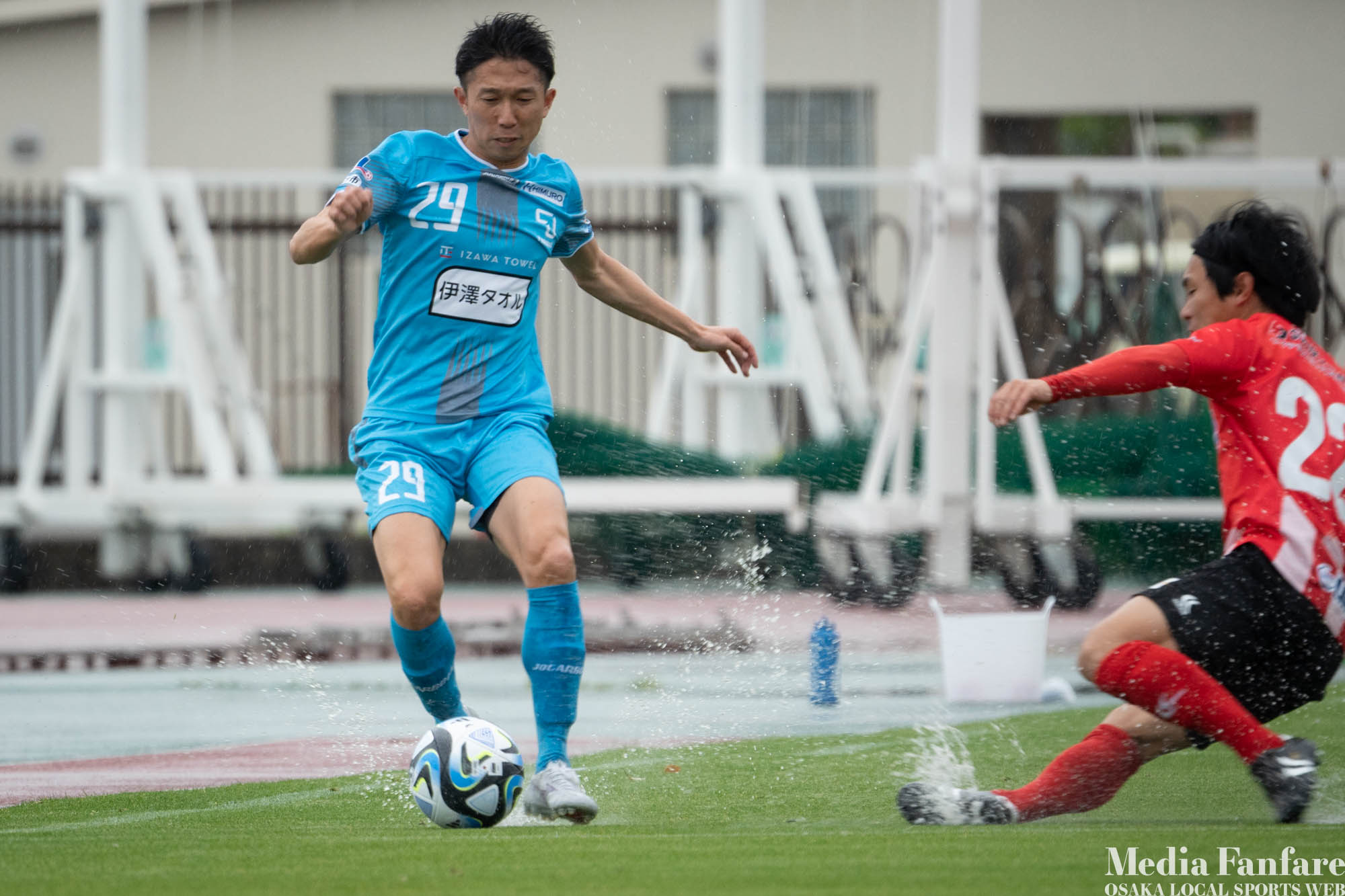 スリッピーなグラウンド状況ではスライディングタックルも多くなるので、こういう日は怪我の心配も増えます。