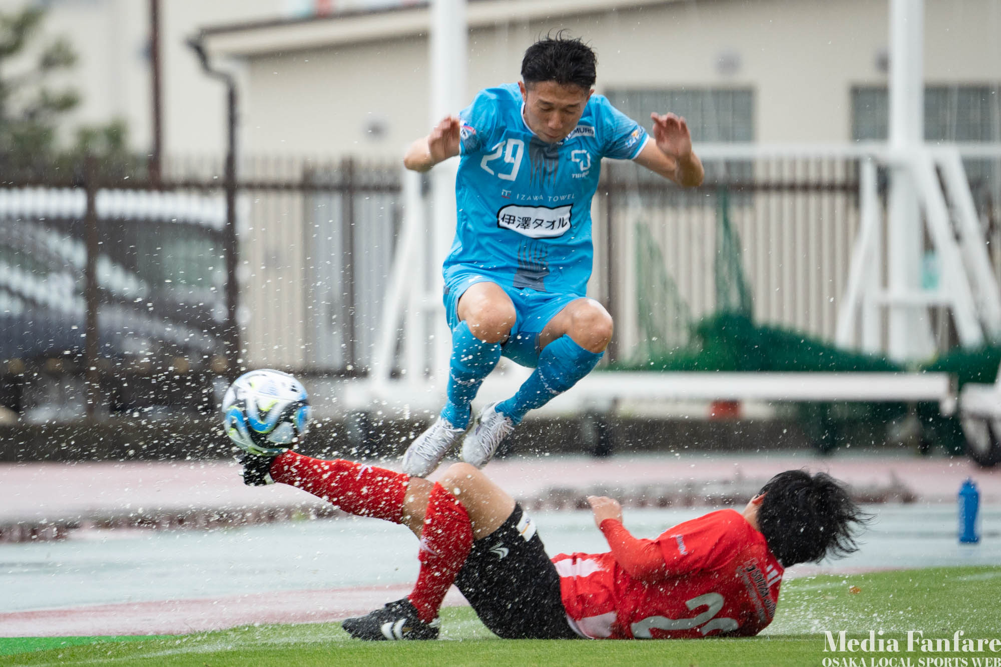 鋭いスライディングタックルをジャンプでかわす、小谷選手。