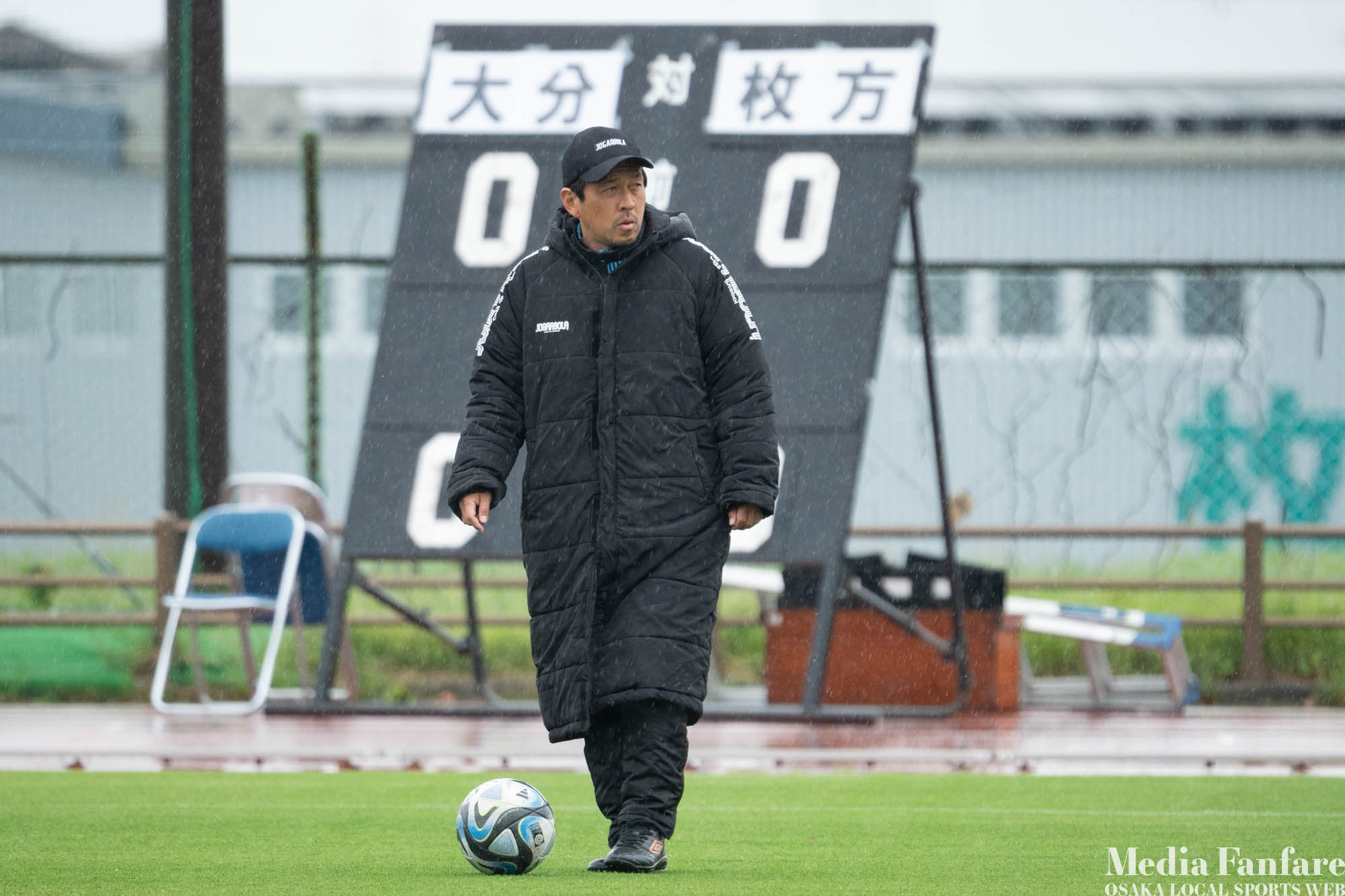 何とか得点を、と前線に人数をかけるも、なかなかフィニッシュまで持って行けず試合終了。PKで1点、セットプレーで1点と、雨の日のお手本のような戦い方を見せたヴェルスパ大分が0 – 2で勝利。