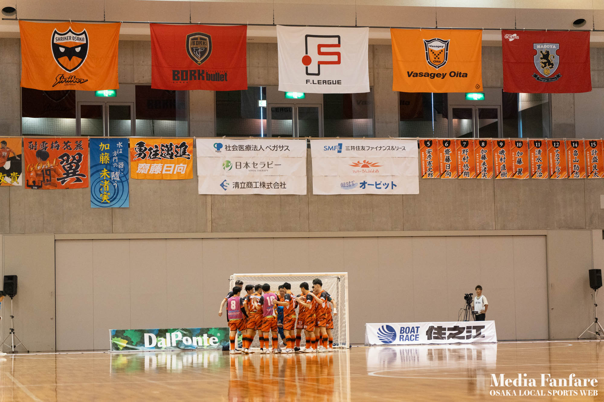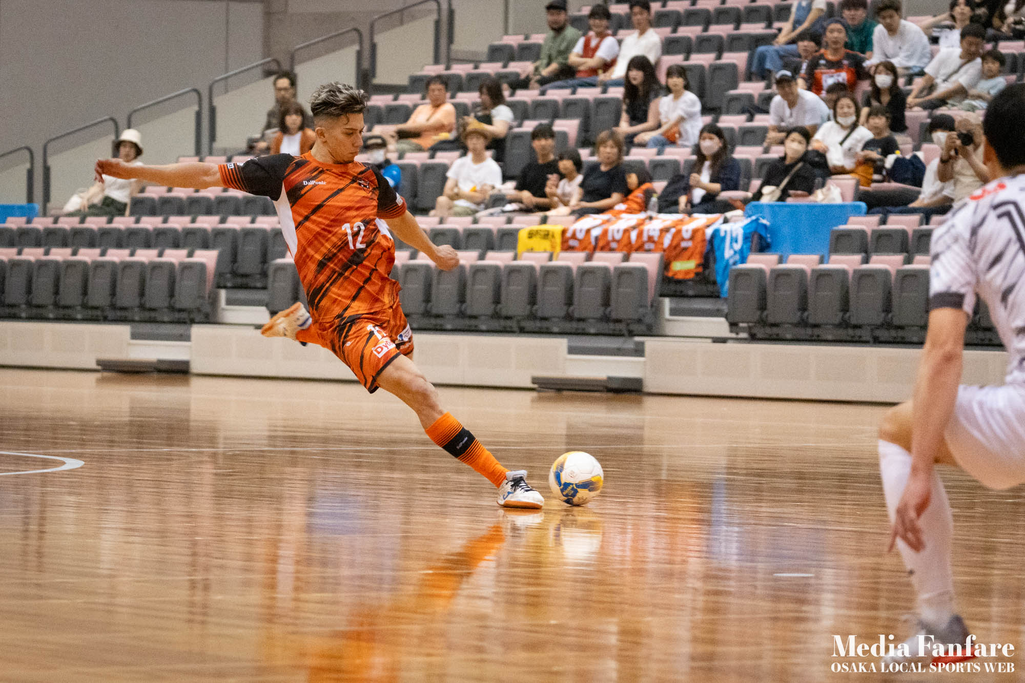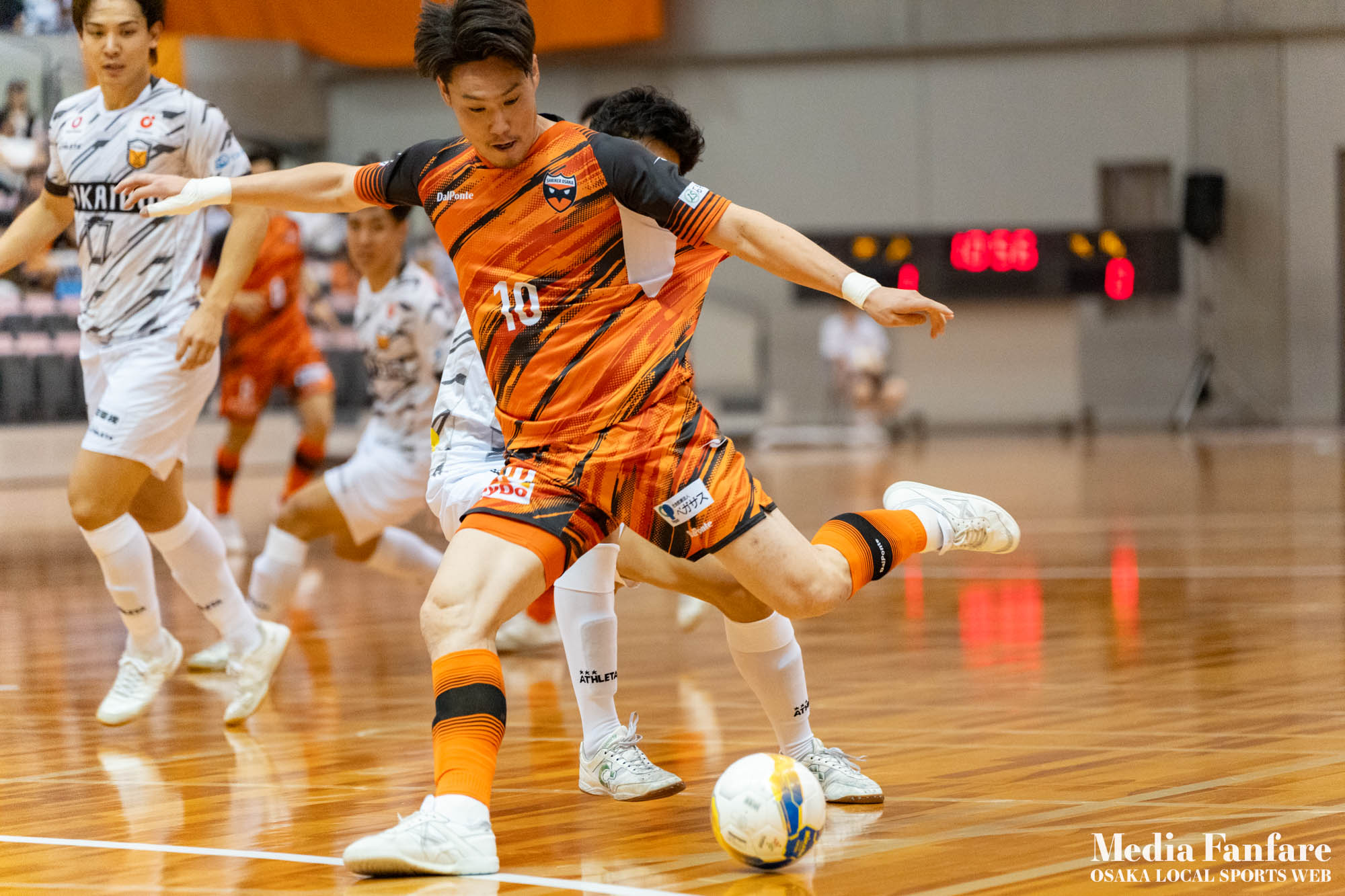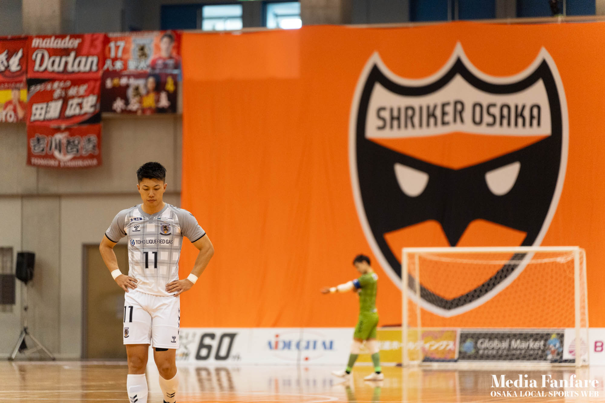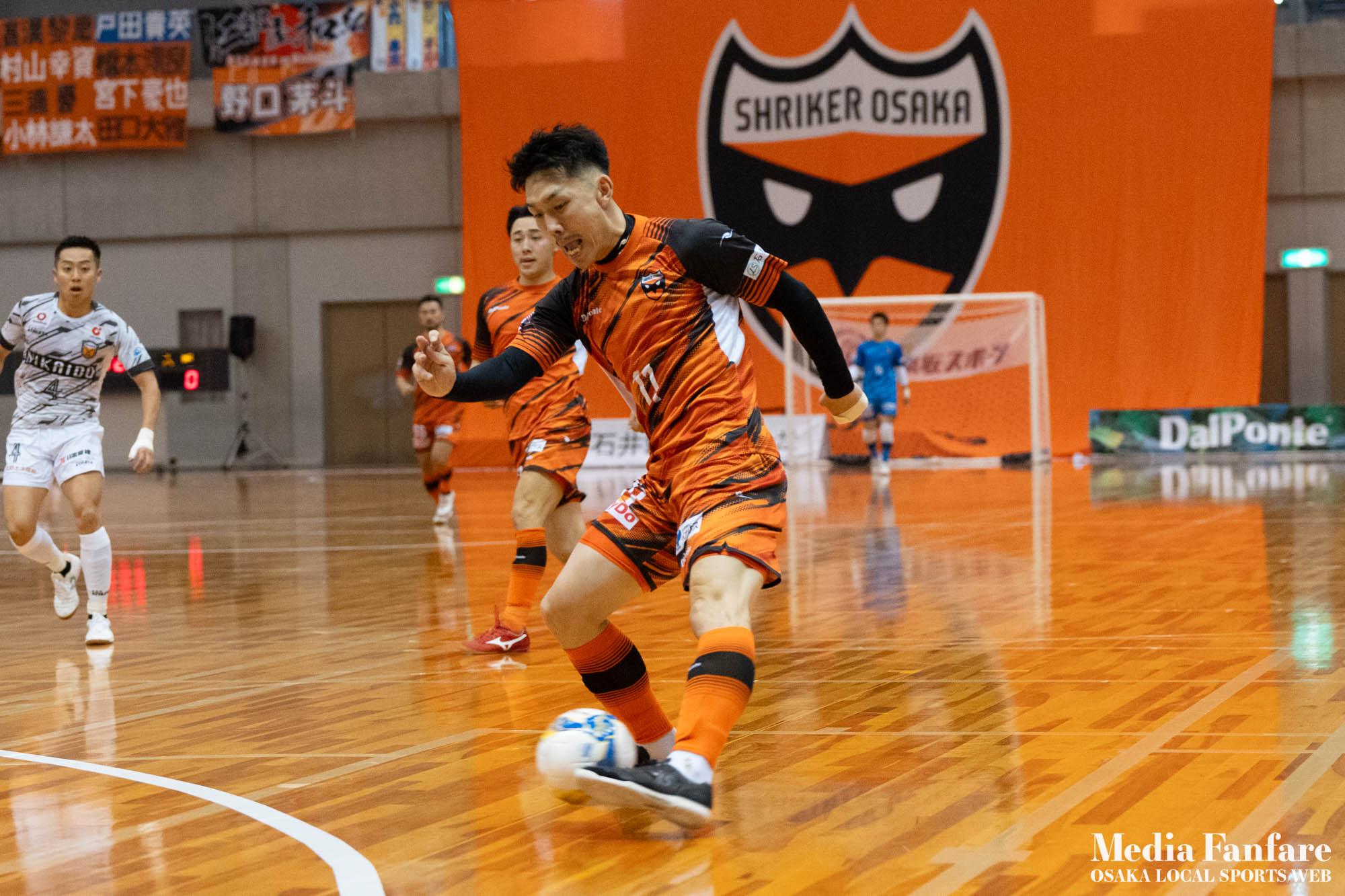 6月172023 [Fリーグ 第4節]新10番がメモリアルマッチでゴール、チームは3連勝(2023-24) シュライカー大阪 Contents1 加藤翼選手、Fリーグ通算100試合出場2 早い時間での失点、先制はバサジィ大分3 翼、未渚実のW加藤のゴールで勝負を決める4 ボルクバレット北九州vs名古屋オーシャンズ5 NEXT HOMEGAME6 PHOTO GALLERY 加藤翼選手、Fリーグ通算100試合出場 前節アウェーで立川アスレティックFCに勝利し、シーズン初の連勝と勢いに乗るシュライカー大阪。 6/17(土)に開催された第4節、ホームの岸和田市総合体育館にてバサジィ大分を迎え撃ちました。 なお、この日は上記の試合後に、ボルクバレット北九州 vs 名古屋オーシャンズの一戦も共同開催されました。 この試合でシュライカー大阪の加藤翼選手が、Fリーグ通算100試合出場を達成。キックオフ前にセレモニーが催され、息子さんから花束が贈呈されました。昨シーズンで現役引退された、相井忍選手から背番号10を引き継いだ加藤翼選手。大阪のエースとして、さらなる期待がかかります。 今節は清水寛治選手ではなく、中井駿斗選手がスタメン入り。 [スターティングメンバー] #7.野村 悠翔 (FP) #12.ナカマツ ルアン (FP) #23.中井 駿斗 (FP) #98.田村 研人 (FP) #16.樋口 就大 (GK) [ベンチメンバー] #6.齋藤 日向 (FP) #8.加藤 未渚実 (FP) #9.磯村 直樹 (FP) #10.加藤 翼 (FP) #11.清水 寛治 (FP) #14.畠山 勁志 (FP) #18.田村 友貴 (FP) #47.井口 凜太郎 (FP) #99.眞野 翔太 (GK) 早い時間での失点、先制はバサジィ大分 試合開始からおよそ3分。バサジィ大分が自陣からのロングパスを胸でトラップしてボレーシュート。早い時間帯に大分が先制します。 なかなか流れをつかめないシュライカー大阪でしたが、前半15分、清水寛治選手が左サイドを縦に抜けて中へ折り返す。 それを好調の野村悠翔選手が詰めて同点ゴール。今シーズン4得点目、順調に得点を重ねます。 翼、未渚実のW加藤のゴールで勝負を決める 1-1と同点で迎えた後半。前半のスタメンとは違う4人がフィールドに立ちます。 FKのキッカーを任されているナカマツ ルアン選手。左足から放たれる強烈なシュートは、今シーズンのシュライカー大阪の大きな武器のひとつ。 28分、GK樋口選手の手から前線の齋藤選手、加藤翼選手と少ないパスでつなぎシュート。GKの足にはじかれるも、シュートの勢いが勝り弧を描いてゴールネットを揺らす。 加藤翼選手の、メモリアルマッチを自ら祝福するゴールでシュライカー大阪が逆転。 後半、バサジィ大分のファウルがかさみ、ファウル数は5。フットサルでは、前後半それぞれでファウル数が6になると第2PK(※)が与えられます。 ※第2PKとは、ゴールから10メートル離れた位置にある、第2ペナルティマークから蹴るフリーキックのこと。通常のフリーキックでは、守る側のチームの選手がボールの前に並んで壁を作り、シュートを妨害することができますが、第2PKでは壁を作ることが出来ません。キッカーとキーパーの1対1となるPKと同じようになるため、第2PKと呼ばれています。 残り3分半ほどになったところで、1点を追うバサジィ大分はパワープレーを仕掛けます。 清水寛治選手がボールとディフェンスの間にうまく身体を入れ、後ろからプレスにきた大分の選手に倒されファウル獲得。これが6つ目のファウルとなり、第2PKで追加点のチャンス。残り時間が少なく、焦っている大分の選手のファウルを誘う清水選手の隠れたファインプレー。 蹴るのは、加藤未渚実選手。 ゆっくり助走をつけ、ゴレイロの動きを見てシュート。 見事ゴール右サイドに突き刺さり、ダメ押しの追加点。 今節も好セーブ連発のGK樋口就大選手。今季サテライトから昇格したとは思えない安定感。 3-1で試合終了、シュライカー大阪は見事3連勝。 ボルクバレット北九州vs名古屋オーシャンズ 共同開催の2試合目は、ボルクバレット北九州 vs 名古屋オーシャンズ。試合の合間にキッチンカーの「魯肉飯(ルーローハン)カレー」でエネルギー補給。 2試合目も1点を争う好ゲームとなりました。アンドレシート選手のゴールで、3連勝中の名古屋オーシャンズが先制するも、前半終盤にボルクバレット北九州のジュニーニョ選手が決めて同点に。さらに、後半ジュニーニョ選手が2点目を決めて北九州が逆転。いよいよ名古屋の連勝ストップか、と思いきや、さすがは王者。29分、34分にダルラン選手が連続ゴールを決め、2-3で名古屋オーシャンズが勝利。開幕から4連勝と、名古屋が前評判通りの強さを見せています。 NEXT HOMEGAME シュライカー大阪の次のホームゲームは、7/2(日)の強敵湘南ベルマーレ戦。4試合で22得点と驚異的なペースでゴールを量産している湘南ベルマーレ。一方、これまでリーグ最少失点数5の堅守が光るシュライカー大阪。2位と3位、注目の上位対決となります。(2023/6/20 時点) 日時2023/7/2(日) 13:00キックオフ 会場丸善インテックアリーナ大阪 (※2023年7月1日(土)からは「Asueアリーナ大阪 」に名称変更) 試合シュライカー大阪 vs 湘南ベルマーレ (シ