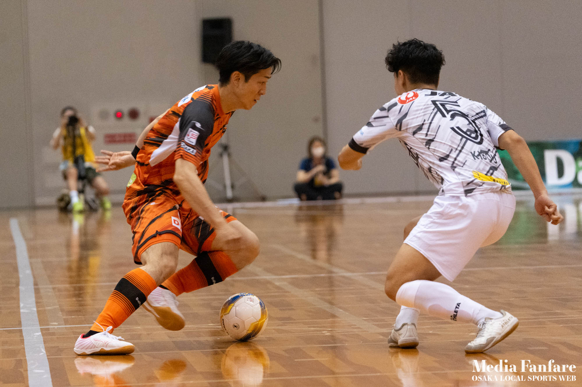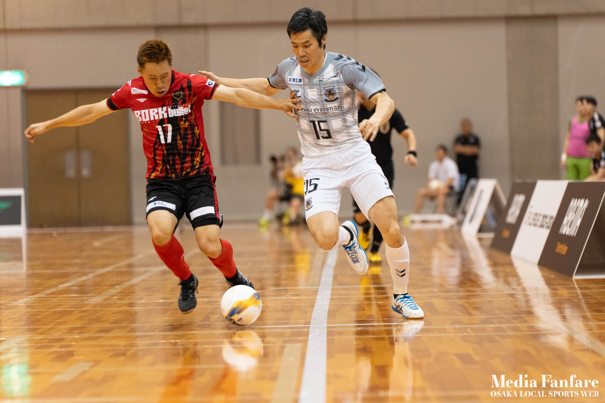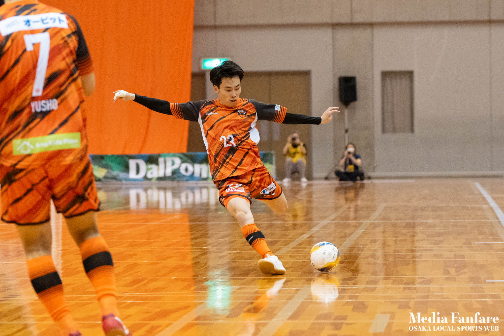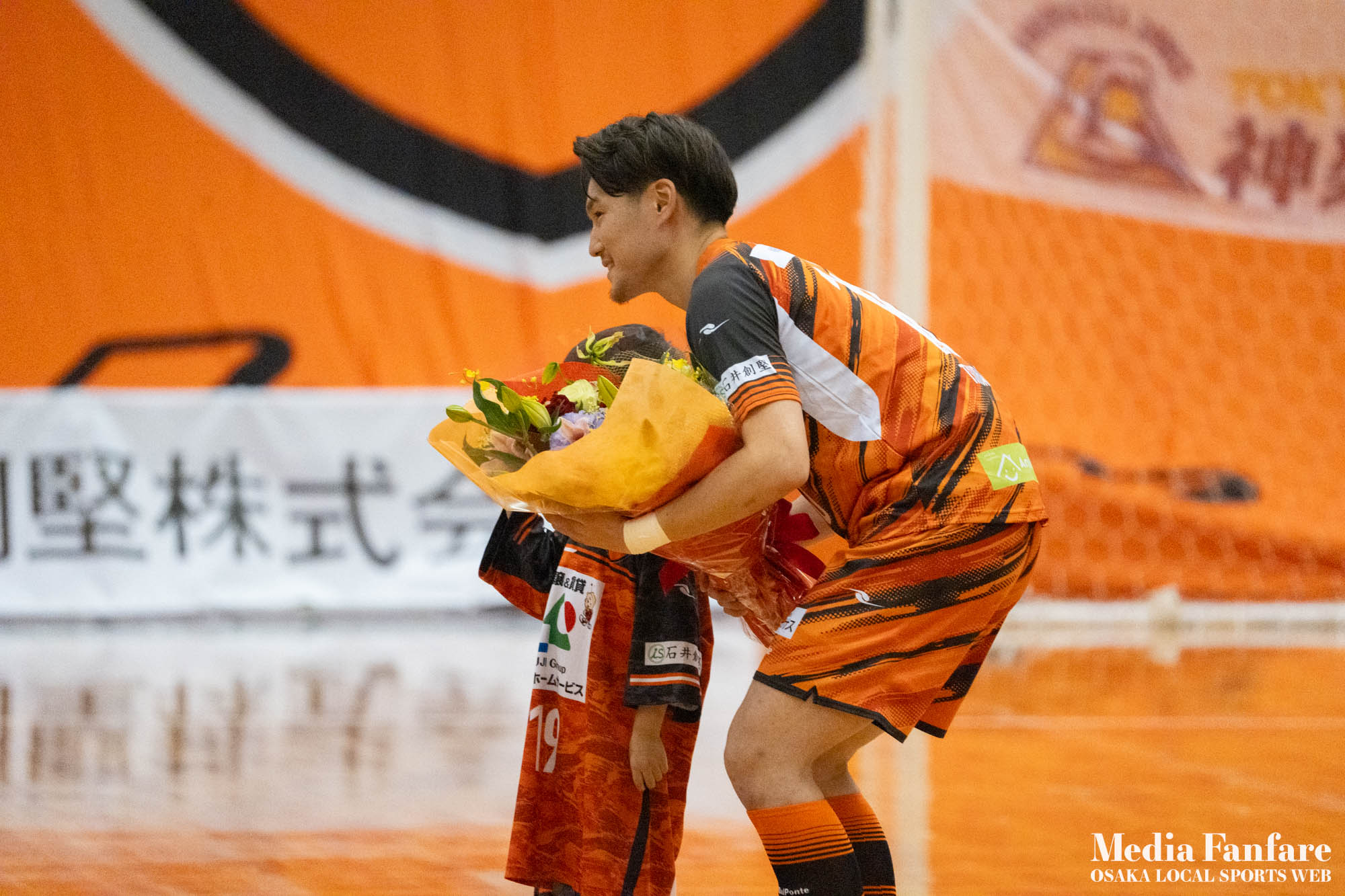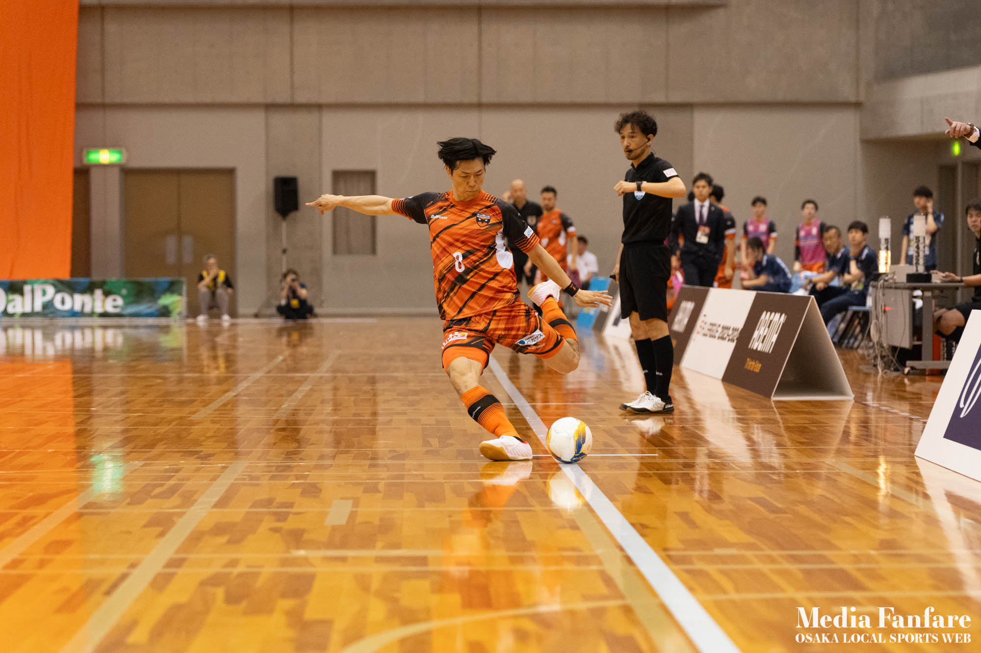 6月172023 [Fリーグ 第4節]新10番がメモリアルマッチでゴール、チームは3連勝(2023-24) シュライカー大阪 Contents1 加藤翼選手、Fリーグ通算100試合出場2 早い時間での失点、先制はバサジィ大分3 翼、未渚実のW加藤のゴールで勝負を決める4 ボルクバレット北九州vs名古屋オーシャンズ5 NEXT HOMEGAME6 PHOTO GALLERY 加藤翼選手、Fリーグ通算100試合出場 前節アウェーで立川アスレティックFCに勝利し、シーズン初の連勝と勢いに乗るシュライカー大阪。 6/17(土)に開催された第4節、ホームの岸和田市総合体育館にてバサジィ大分を迎え撃ちました。 なお、この日は上記の試合後に、ボルクバレット北九州 vs 名古屋オーシャンズの一戦も共同開催されました。 この試合でシュライカー大阪の加藤翼選手が、Fリーグ通算100試合出場を達成。キックオフ前にセレモニーが催され、息子さんから花束が贈呈されました。昨シーズンで現役引退された、相井忍選手から背番号10を引き継いだ加藤翼選手。大阪のエースとして、さらなる期待がかかります。 今節は清水寛治選手ではなく、中井駿斗選手がスタメン入り。 [スターティングメンバー] #7.野村 悠翔 (FP) #12.ナカマツ ルアン (FP) #23.中井 駿斗 (FP) #98.田村 研人 (FP) #16.樋口 就大 (GK) [ベンチメンバー] #6.齋藤 日向 (FP) #8.加藤 未渚実 (FP) #9.磯村 直樹 (FP) #10.加藤 翼 (FP) #11.清水 寛治 (FP) #14.畠山 勁志 (FP) #18.田村 友貴 (FP) #47.井口 凜太郎 (FP) #99.眞野 翔太 (GK) 早い時間での失点、先制はバサジィ大分 試合開始からおよそ3分。バサジィ大分が自陣からのロングパスを胸でトラップしてボレーシュート。早い時間帯に大分が先制します。 なかなか流れをつかめないシュライカー大阪でしたが、前半15分、清水寛治選手が左サイドを縦に抜けて中へ折り返す。 それを好調の野村悠翔選手が詰めて同点ゴール。今シーズン4得点目、順調に得点を重ねます。 翼、未渚実のW加藤のゴールで勝負を決める 1-1と同点で迎えた後半。前半のスタメンとは違う4人がフィールドに立ちます。 FKのキッカーを任されているナカマツ ルアン選手。左足から放たれる強烈なシュートは、今シーズンのシュライカー大阪の大きな武器のひとつ。 28分、GK樋口選手の手から前線の齋藤選手、加藤翼選手と少ないパスでつなぎシュート。GKの足にはじかれるも、シュートの勢いが勝り弧を描いてゴールネットを揺らす。 加藤翼選手の、メモリアルマッチを自ら祝福するゴールでシュライカー大阪が逆転。 後半、バサジィ大分のファウルがかさみ、ファウル数は5。フットサルでは、前後半それぞれでファウル数が6になると第2PK(※)が与えられます。 ※第2PKとは、ゴールから10メートル離れた位置にある、第2ペナルティマークから蹴るフリーキックのこと。通常のフリーキックでは、守る側のチームの選手がボールの前に並んで壁を作り、シュートを妨害することができますが、第2PKでは壁を作ることが出来ません。キッカーとキーパーの1対1となるPKと同じようになるため、第2PKと呼ばれています。 残り3分半ほどになったところで、1点を追うバサジィ大分はパワープレーを仕掛けます。 清水寛治選手がボールとディフェンスの間にうまく身体を入れ、後ろからプレスにきた大分の選手に倒されファウル獲得。これが6つ目のファウルとなり、第2PKで追加点のチャンス。残り時間が少なく、焦っている大分の選手のファウルを誘う清水選手の隠れたファインプレー。 蹴るのは、加藤未渚実選手。 ゆっくり助走をつけ、ゴレイロの動きを見てシュート。 見事ゴール右サイドに突き刺さり、ダメ押しの追加点。 今節も好セーブ連発のGK樋口就大選手。今季サテライトから昇格したとは思えない安定感。 3-1で試合終了、シュライカー大阪は見事3連勝。 ボルクバレット北九州vs名古屋オーシャンズ 共同開催の2試合目は、ボルクバレット北九州 vs 名古屋オーシャンズ。試合の合間にキッチンカーの「魯肉飯(ルーローハン)カレー」でエネルギー補給。 2試合目も1点を争う好ゲームとなりました。アンドレシート選手のゴールで、3連勝中の名古屋オーシャンズが先制するも、前半終盤にボルクバレット北九州のジュニーニョ選手が決めて同点に。さらに、後半ジュニーニョ選手が2点目を決めて北九州が逆転。いよいよ名古屋の連勝ストップか、と思いきや、さすがは王者。29分、34分にダルラン選手が連続ゴールを決め、2-3で名古屋オーシャンズが勝利。開幕から4連勝と、名古屋が前評判通りの強さを見せています。 NEXT HOMEGAME シュライカー大阪の次のホームゲームは、7/2(日)の強敵湘南ベルマーレ戦。4試合で22得点と驚異的なペースでゴールを量産している湘南ベルマーレ。一方、これまでリーグ最少失点数5の堅守が光るシュライカー大阪。2位と3位、注目の上位対決となります。(2023/6/20 時点) 日時2023/7/2(日) 13:00キックオフ 会場丸善インテックアリーナ大阪 (※2023年7月1日(土)からは「Asueアリーナ大阪 」に名称変更) 試合シュライカー大阪 vs 湘南ベルマーレ (シ