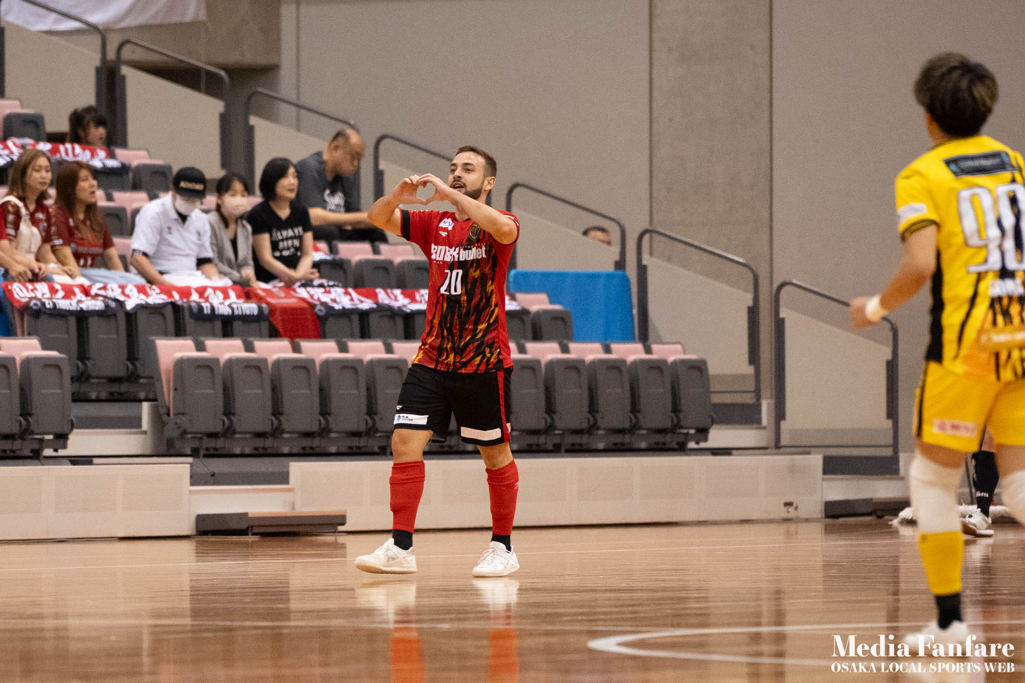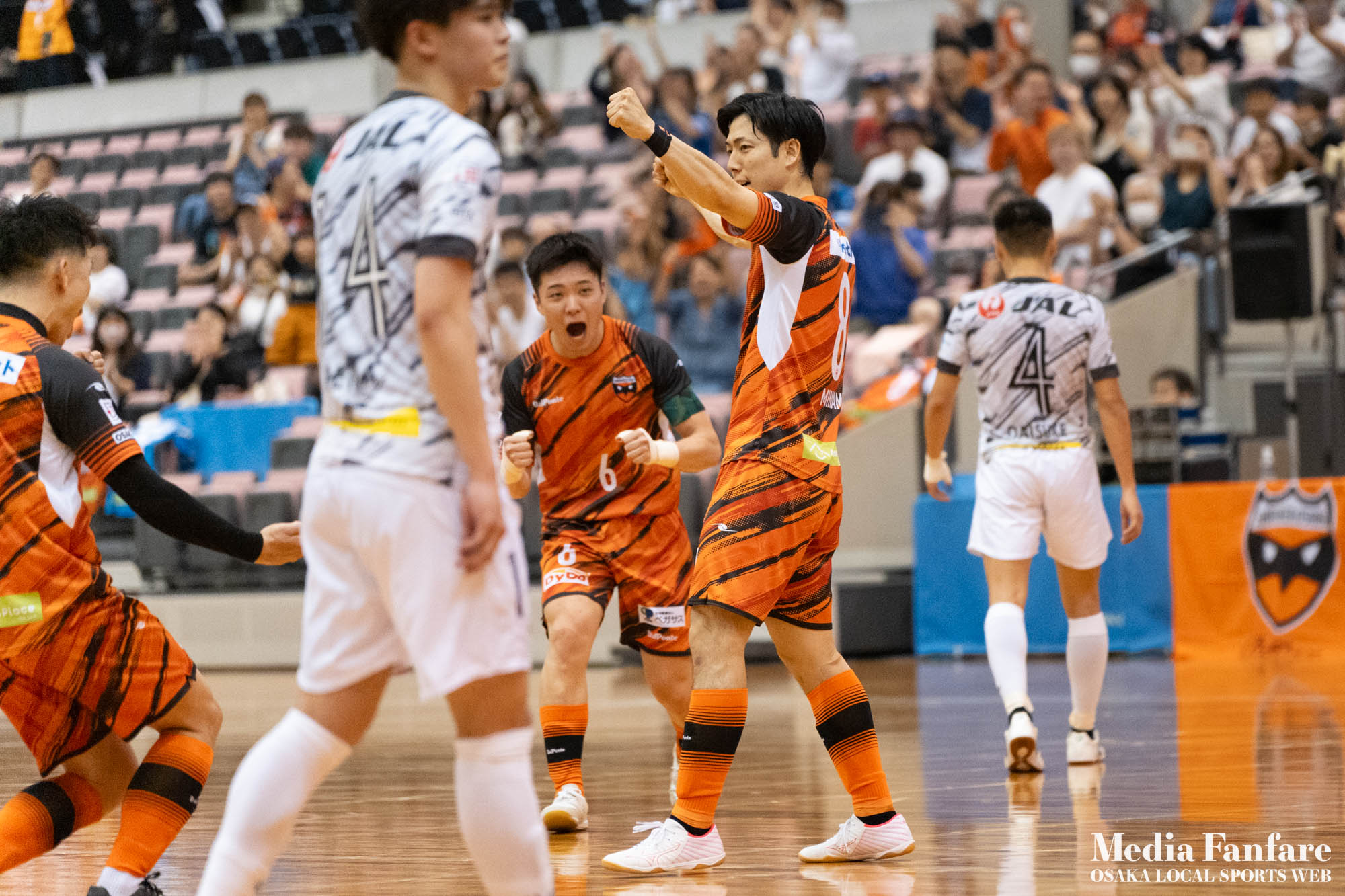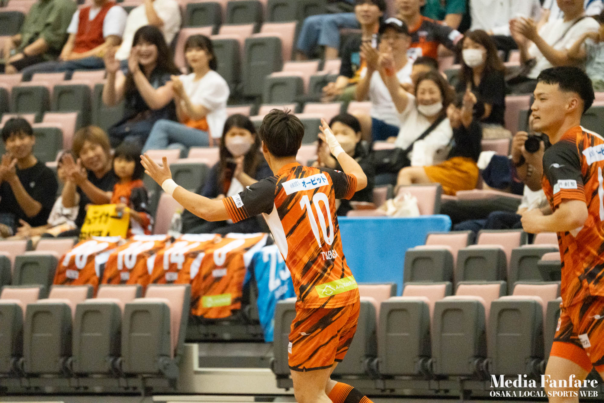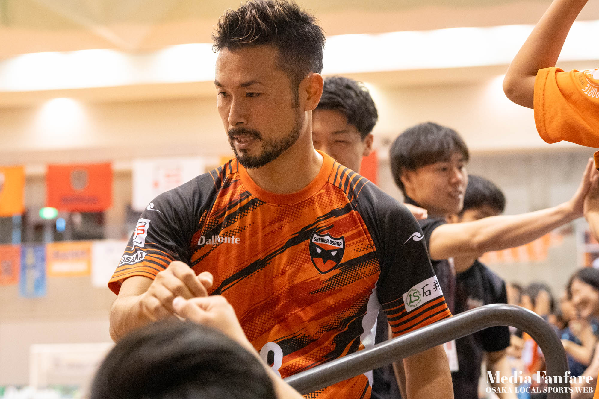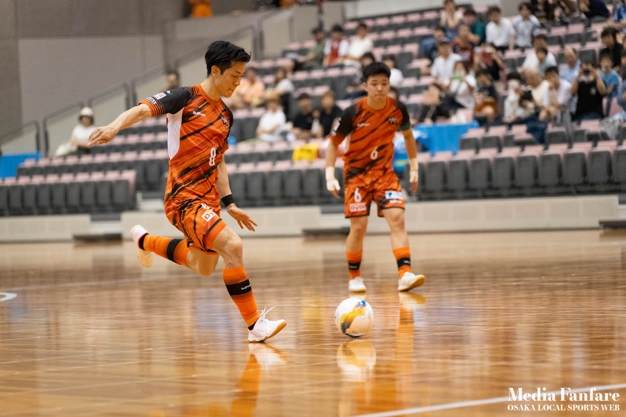 6月172023 [Fリーグ 第4節]新10番がメモリアルマッチでゴール、チームは3連勝(2023-24) シュライカー大阪 Contents1 加藤翼選手、Fリーグ通算100試合出場2 早い時間での失点、先制はバサジィ大分3 翼、未渚実のW加藤のゴールで勝負を決める4 ボルクバレット北九州vs名古屋オーシャンズ5 NEXT HOMEGAME6 PHOTO GALLERY 加藤翼選手、Fリーグ通算100試合出場 前節アウェーで立川アスレティックFCに勝利し、シーズン初の連勝と勢いに乗るシュライカー大阪。 6/17(土)に開催された第4節、ホームの岸和田市総合体育館にてバサジィ大分を迎え撃ちました。 なお、この日は上記の試合後に、ボルクバレット北九州 vs 名古屋オーシャンズの一戦も共同開催されました。 この試合でシュライカー大阪の加藤翼選手が、Fリーグ通算100試合出場を達成。キックオフ前にセレモニーが催され、息子さんから花束が贈呈されました。昨シーズンで現役引退された、相井忍選手から背番号10を引き継いだ加藤翼選手。大阪のエースとして、さらなる期待がかかります。 今節は清水寛治選手ではなく、中井駿斗選手がスタメン入り。 [スターティングメンバー] #7.野村 悠翔 (FP) #12.ナカマツ ルアン (FP) #23.中井 駿斗 (FP) #98.田村 研人 (FP) #16.樋口 就大 (GK) [ベンチメンバー] #6.齋藤 日向 (FP) #8.加藤 未渚実 (FP) #9.磯村 直樹 (FP) #10.加藤 翼 (FP) #11.清水 寛治 (FP) #14.畠山 勁志 (FP) #18.田村 友貴 (FP) #47.井口 凜太郎 (FP) #99.眞野 翔太 (GK) 早い時間での失点、先制はバサジィ大分 試合開始からおよそ3分。バサジィ大分が自陣からのロングパスを胸でトラップしてボレーシュート。早い時間帯に大分が先制します。 なかなか流れをつかめないシュライカー大阪でしたが、前半15分、清水寛治選手が左サイドを縦に抜けて中へ折り返す。 それを好調の野村悠翔選手が詰めて同点ゴール。今シーズン4得点目、順調に得点を重ねます。 翼、未渚実のW加藤のゴールで勝負を決める 1-1と同点で迎えた後半。前半のスタメンとは違う4人がフィールドに立ちます。 FKのキッカーを任されているナカマツ ルアン選手。左足から放たれる強烈なシュートは、今シーズンのシュライカー大阪の大きな武器のひとつ。 28分、GK樋口選手の手から前線の齋藤選手、加藤翼選手と少ないパスでつなぎシュート。GKの足にはじかれるも、シュートの勢いが勝り弧を描いてゴールネットを揺らす。 加藤翼選手の、メモリアルマッチを自ら祝福するゴールでシュライカー大阪が逆転。 後半、バサジィ大分のファウルがかさみ、ファウル数は5。フットサルでは、前後半それぞれでファウル数が6になると第2PK(※)が与えられます。 ※第2PKとは、ゴールから10メートル離れた位置にある、第2ペナルティマークから蹴るフリーキックのこと。通常のフリーキックでは、守る側のチームの選手がボールの前に並んで壁を作り、シュートを妨害することができますが、第2PKでは壁を作ることが出来ません。キッカーとキーパーの1対1となるPKと同じようになるため、第2PKと呼ばれています。 残り3分半ほどになったところで、1点を追うバサジィ大分はパワープレーを仕掛けます。 清水寛治選手がボールとディフェンスの間にうまく身体を入れ、後ろからプレスにきた大分の選手に倒されファウル獲得。これが6つ目のファウルとなり、第2PKで追加点のチャンス。残り時間が少なく、焦っている大分の選手のファウルを誘う清水選手の隠れたファインプレー。 蹴るのは、加藤未渚実選手。 ゆっくり助走をつけ、ゴレイロの動きを見てシュート。 見事ゴール右サイドに突き刺さり、ダメ押しの追加点。 今節も好セーブ連発のGK樋口就大選手。今季サテライトから昇格したとは思えない安定感。 3-1で試合終了、シュライカー大阪は見事3連勝。 ボルクバレット北九州vs名古屋オーシャンズ 共同開催の2試合目は、ボルクバレット北九州 vs 名古屋オーシャンズ。試合の合間にキッチンカーの「魯肉飯(ルーローハン)カレー」でエネルギー補給。 2試合目も1点を争う好ゲームとなりました。アンドレシート選手のゴールで、3連勝中の名古屋オーシャンズが先制するも、前半終盤にボルクバレット北九州のジュニーニョ選手が決めて同点に。さらに、後半ジュニーニョ選手が2点目を決めて北九州が逆転。いよいよ名古屋の連勝ストップか、と思いきや、さすがは王者。29分、34分にダルラン選手が連続ゴールを決め、2-3で名古屋オーシャンズが勝利。開幕から4連勝と、名古屋が前評判通りの強さを見せています。 NEXT HOMEGAME シュライカー大阪の次のホームゲームは、7/2(日)の強敵湘南ベルマーレ戦。4試合で22得点と驚異的なペースでゴールを量産している湘南ベルマーレ。一方、これまでリーグ最少失点数5の堅守が光るシュライカー大阪。2位と3位、注目の上位対決となります。(2023/6/20 時点) 日時2023/7/2(日) 13:00キックオフ 会場丸善インテックアリーナ大阪 (※2023年7月1日(土)からは「Asueアリーナ大阪 」に名称変更) 試合シュライカー大阪 vs 湘南ベルマーレ (シ