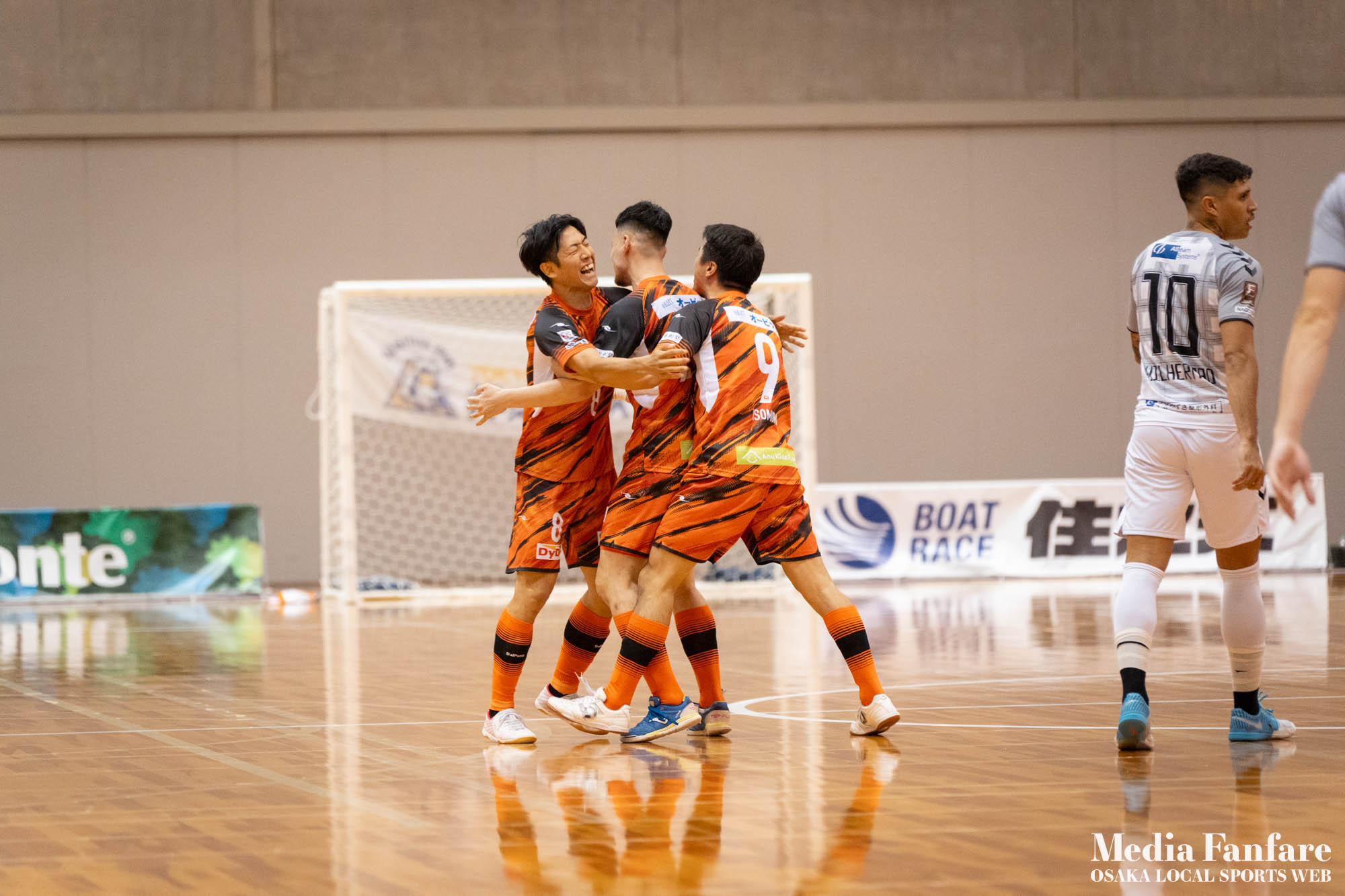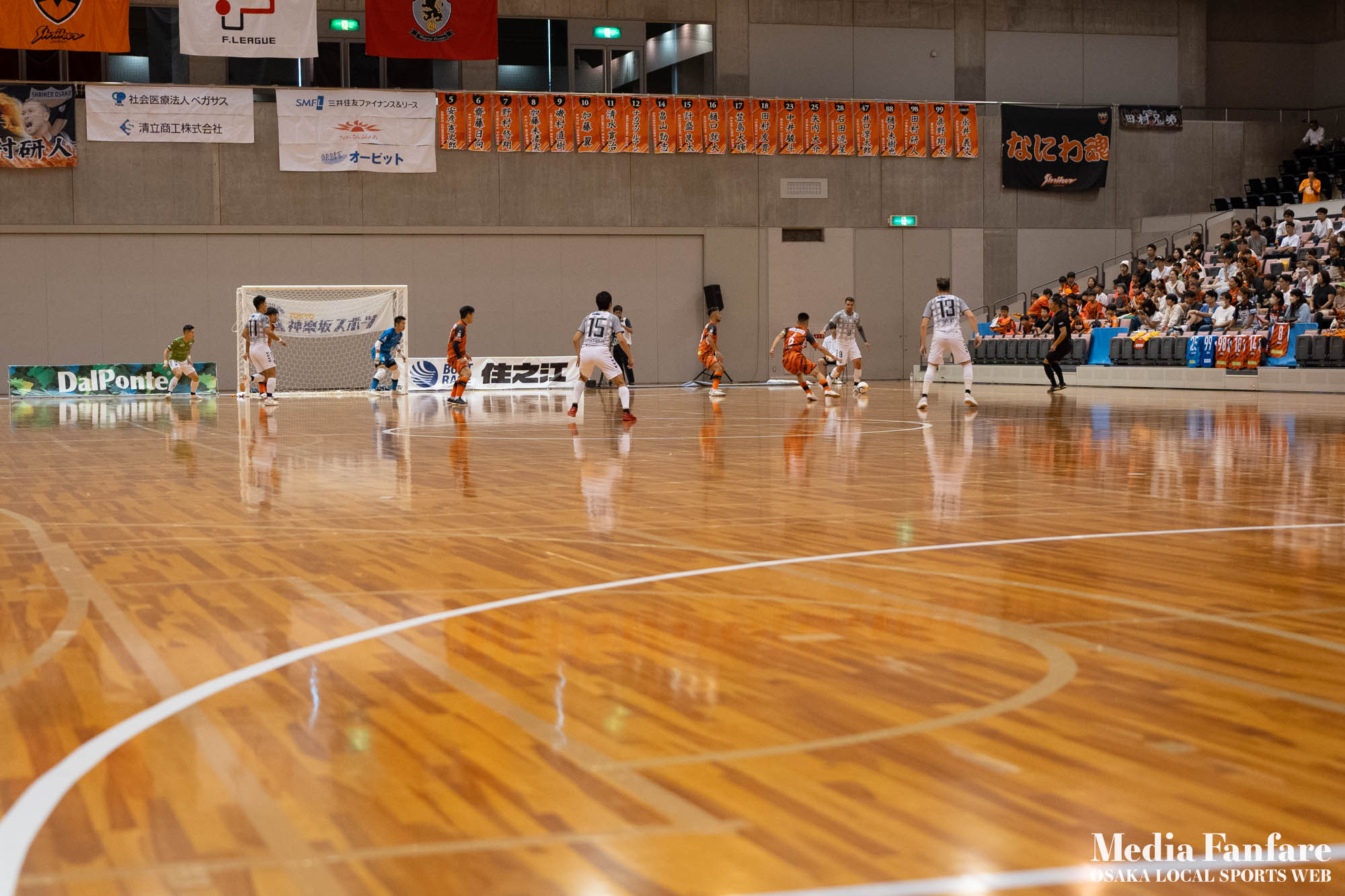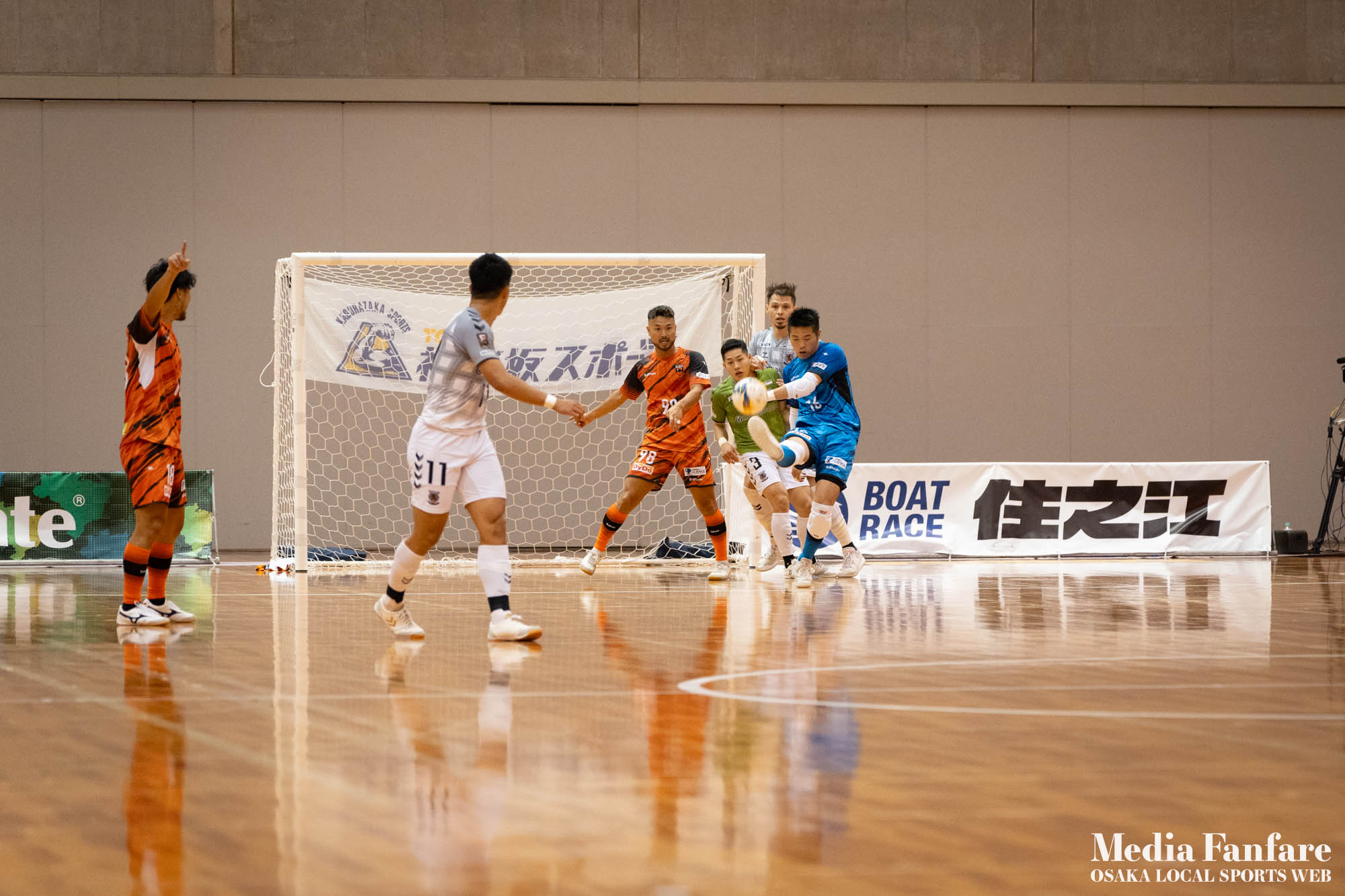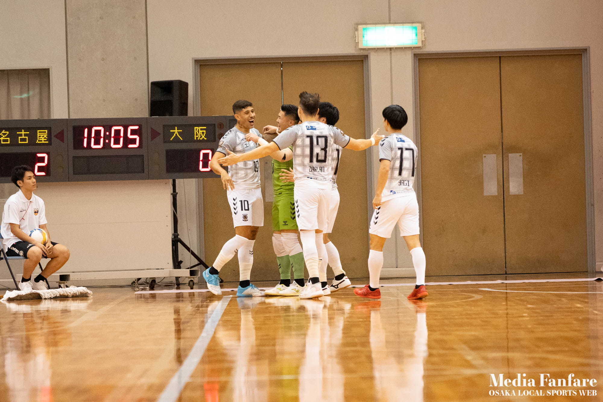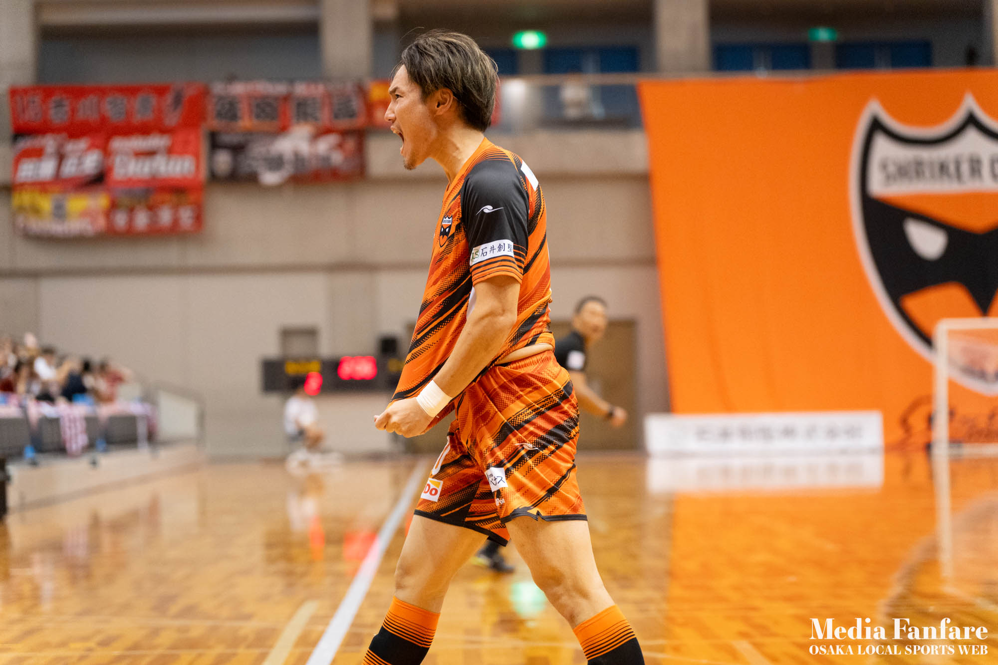 9月022023 [Fリーグ 第13節]まさに死闘!リベンジに燃える名古屋をホームで迎え撃つ(2023-24) シュライカー大阪 Contents1 名古屋が立て続けに2得点2 大阪が2点を返し、前半で試合を振り出しに戻す3 井口凛太朗選手の、強烈な逆転弾4 土壇場で見せた、王者の意地5 NEXT HOMEGAME6 PHOTO GALLERY 9/2(土)、岸和田市総合体育館にて、Fリーグ第13節 シュライカー大阪 vs 名古屋オーシャンズの試合が開催されました。Fリーグもいよいよ後半戦に突入。そろそろ順位の変動もこれまで以上に気にかかる時期になってきましたね。 対戦相手の名古屋オーシャンズは、開幕から13節までで負けたのは1試合のみ。その王者名古屋に唯一土をつけたのがシュライカー大阪。7月の第7節で、1-2でシュライカーがアウェー戦で勝利しています。名古屋としては、借りを返そうといつも以上に気合が入っているはず。同じ相手に連敗するのは、王者としてのプライドも許さないでしょう。一方シュライカー大阪も、リーグ後半も上位争いの中心に残り続けるためには名古屋に連勝して勢いに乗りたいところ。 スターティングメンバー、ベンチメンバーは以下の通り。 [スターティングメンバー] #6.齋藤 日向 (FP) #10.加藤 翼 (FP) #12.ナカマツ ルアン (FP) #98.田村 研人 (FP) #16.樋口 就大 (GK) [ベンチメンバー] #5.安彦 憲史郎 (FP) #7.野村 悠翔 (FP) #8.加藤 未渚実 (FP) #9.磯村 直樹 (FP) #11.清水 寛治 (FP) #14.畠山 勁志 (FP) #18.田村 友貴 (FP) #47.井口 凜太郎 (FP) #99.眞野 翔太 (GK) これまでベンチスタートが続いていた、加藤翼選手。重要な局面で得点を重ね、スターティングメンバー入り。 名古屋が立て続けに2得点 大阪が名古屋の攻撃を受けてカウンターを狙う展開を予想していたが、序盤は大阪が押し込み、立て続けにチャンスを作る。 しかし先制したのは名古屋オーシャンズ。前半6分にやや中途半端なクリアになったところを詰められ、自陣でボールを奪われてしまう。ポストプレーから右サイドを走りこんできたダルラン選手に決められ0-1。 さらに前半9分にも右サイドから強引に中へボールを放り込まれ、ゴール前にこぼれたボールを押し込まれて早い時間に追加点を奪われてしまう。大阪としてはディフェンスの枚数も足りており、守備が崩されたわけでもなくもったいない2失点。 大阪が2点を返し、前半で試合を振り出しに戻す なんとか早い時間帯に1点を返したいシュライカー大阪。前半14分、右からのコーナーキックをナカマツ ルアン選手が押し込み、1-2。 1点を返して勢いに乗る大阪、前半終了間際に見事なカウンターが炸裂。 自陣から齋藤日向、田村友樹、清水寛治と華麗なパスワークで相手陣内へ切り込み、右からのセンタリングを加藤翼選手が合わせて同点ゴール。大阪が前半のうちに試合を振り出しに戻します。 見事スタメン起用に答えた加藤翼選手。王者名古屋相手に2点先制され、なかなか厳しい状況というムードが漂っていた中、大阪の反撃に会場の空気も一転、歓喜に包まれます。 井口凛太朗選手の、強烈な逆転弾 大阪の反撃はまだ終わりません。大阪ボールで後半開始。最初のプレーでコーナーキックを獲得。 コーナーは中へは入れず、バックパスを選択。これを井口凛太朗選手が地を這うような強烈なミドルシュートを放ち、ゴールに突き刺さります。なんと2失点から3点返し、大阪が逆転。 身体を張って、好セーブを連発するGK樋口就大選手。後半開始早々の勝ち越し点だっただけに、残り時間はまだたっぷり。堅守の大阪といえ、攻撃力のある名古屋相手に1点のリードを守り切るのは至難の業。 追加点が欲しい大阪。磯村直樹選手がGKと1対1で追加点のチャンスを作るも、惜しくもゴールにはならず。 土壇場で見せた、王者の意地 逆転を許した名古屋オーシャンズ、このままでは終われないとプレーの激しさも増します。 名古屋はこの日、2枚目のイエローカード。大阪もファウルが5つたまり、次からのファウルは第2PKを取られてしまうため、強いコンタクトは避けないといけない状況。両チーム身体を張った手に汗握る攻防戦に目が離せません。 後半36分まで1点のリードを死守し続けたシュライカー大阪。「このまま逃げ切れるかも・・・」と、名古屋に連勝という快挙が頭をよぎった頃、さらに試合が動きます。 パワープレーで猛攻を仕掛ける名古屋が得点ランクトップを走るアンドレシート選手のゴールでついに同点。土壇場で追いつき、王者の意地を見せた名古屋オーシャンズ。 残り時間は、双方めまぐるしいパワープレーの応酬。4色のユニフォームが密集するのもフットサルならではの光景。 最後の最後までどうなるのか分からない試合でしたが、前半2点ずつ、後半は1点ずつを取り合い3-3のまま試合終了。一瞬たりとも目が離せないスリリングな展開が続き、フットサルの醍醐味が詰まった素晴らしい試合でした。 NEXT HOMEGAME 名古屋戦のあと、第14節のエスポラーダ北海道とのアウェー戦も2-2で引き分け。シュライカー大阪は勝点23で5位をキ