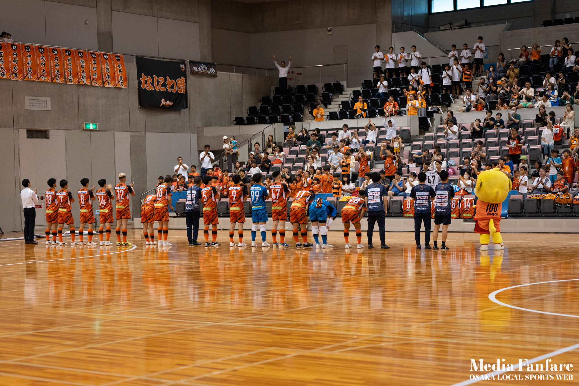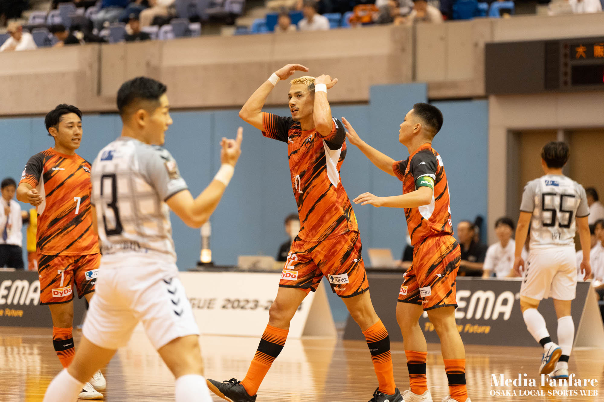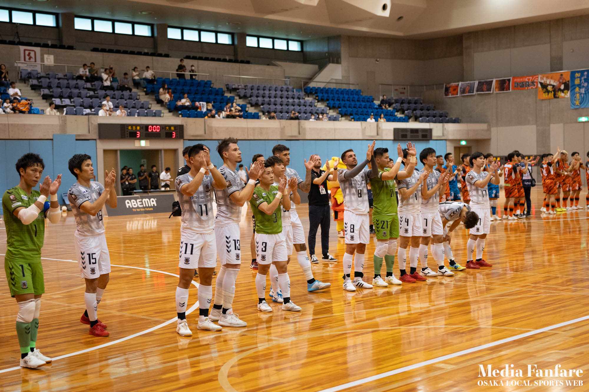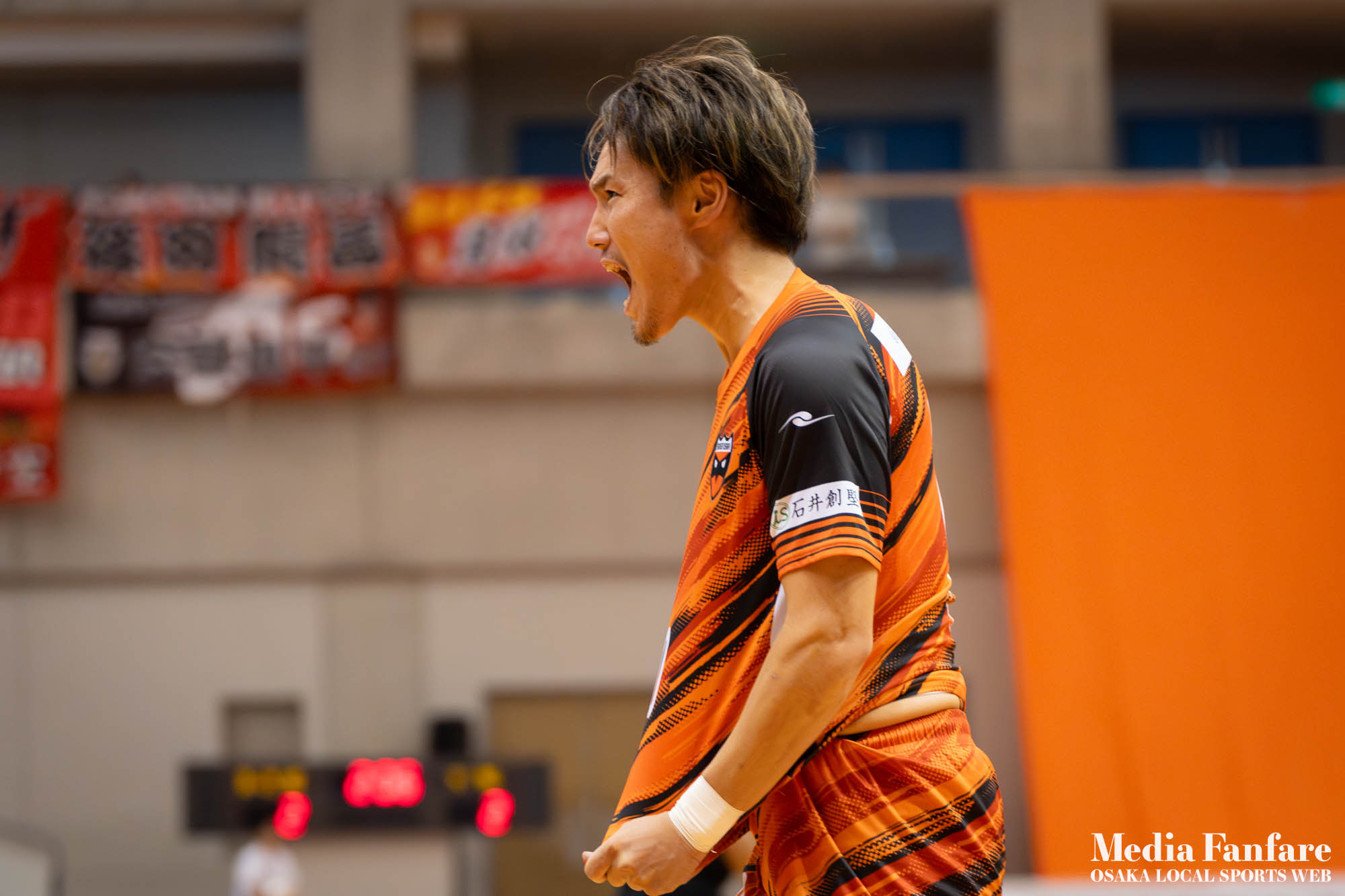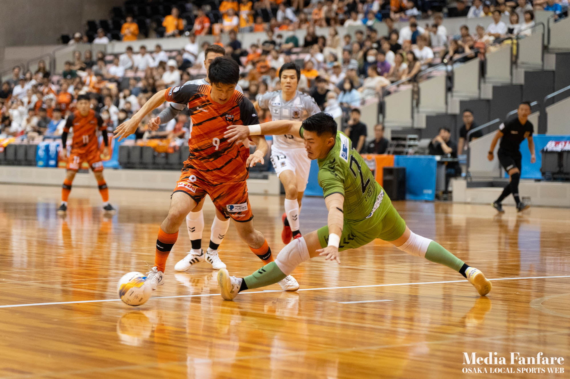 9月022023 [Fリーグ 第13節]まさに死闘!リベンジに燃える名古屋をホームで迎え撃つ(2023-24) シュライカー大阪 Contents1 名古屋が立て続けに2得点2 大阪が2点を返し、前半で試合を振り出しに戻す3 井口凛太朗選手の、強烈な逆転弾4 土壇場で見せた、王者の意地5 NEXT HOMEGAME6 PHOTO GALLERY 9/2(土)、岸和田市総合体育館にて、Fリーグ第13節 シュライカー大阪 vs 名古屋オーシャンズの試合が開催されました。Fリーグもいよいよ後半戦に突入。そろそろ順位の変動もこれまで以上に気にかかる時期になってきましたね。 対戦相手の名古屋オーシャンズは、開幕から13節までで負けたのは1試合のみ。その王者名古屋に唯一土をつけたのがシュライカー大阪。7月の第7節で、1-2でシュライカーがアウェー戦で勝利しています。名古屋としては、借りを返そうといつも以上に気合が入っているはず。同じ相手に連敗するのは、王者としてのプライドも許さないでしょう。一方シュライカー大阪も、リーグ後半も上位争いの中心に残り続けるためには名古屋に連勝して勢いに乗りたいところ。 スターティングメンバー、ベンチメンバーは以下の通り。 [スターティングメンバー] #6.齋藤 日向 (FP) #10.加藤 翼 (FP) #12.ナカマツ ルアン (FP) #98.田村 研人 (FP) #16.樋口 就大 (GK) [ベンチメンバー] #5.安彦 憲史郎 (FP) #7.野村 悠翔 (FP) #8.加藤 未渚実 (FP) #9.磯村 直樹 (FP) #11.清水 寛治 (FP) #14.畠山 勁志 (FP) #18.田村 友貴 (FP) #47.井口 凜太郎 (FP) #99.眞野 翔太 (GK) これまでベンチスタートが続いていた、加藤翼選手。重要な局面で得点を重ね、スターティングメンバー入り。 名古屋が立て続けに2得点 大阪が名古屋の攻撃を受けてカウンターを狙う展開を予想していたが、序盤は大阪が押し込み、立て続けにチャンスを作る。 しかし先制したのは名古屋オーシャンズ。前半6分にやや中途半端なクリアになったところを詰められ、自陣でボールを奪われてしまう。ポストプレーから右サイドを走りこんできたダルラン選手に決められ0-1。 さらに前半9分にも右サイドから強引に中へボールを放り込まれ、ゴール前にこぼれたボールを押し込まれて早い時間に追加点を奪われてしまう。大阪としてはディフェンスの枚数も足りており、守備が崩されたわけでもなくもったいない2失点。 大阪が2点を返し、前半で試合を振り出しに戻す なんとか早い時間帯に1点を返したいシュライカー大阪。前半14分、右からのコーナーキックをナカマツ ルアン選手が押し込み、1-2。 1点を返して勢いに乗る大阪、前半終了間際に見事なカウンターが炸裂。 自陣から齋藤日向、田村友樹、清水寛治と華麗なパスワークで相手陣内へ切り込み、右からのセンタリングを加藤翼選手が合わせて同点ゴール。大阪が前半のうちに試合を振り出しに戻します。 見事スタメン起用に答えた加藤翼選手。王者名古屋相手に2点先制され、なかなか厳しい状況というムードが漂っていた中、大阪の反撃に会場の空気も一転、歓喜に包まれます。 井口凛太朗選手の、強烈な逆転弾 大阪の反撃はまだ終わりません。大阪ボールで後半開始。最初のプレーでコーナーキックを獲得。 コーナーは中へは入れず、バックパスを選択。これを井口凛太朗選手が地を這うような強烈なミドルシュートを放ち、ゴールに突き刺さります。なんと2失点から3点返し、大阪が逆転。 身体を張って、好セーブを連発するGK樋口就大選手。後半開始早々の勝ち越し点だっただけに、残り時間はまだたっぷり。堅守の大阪といえ、攻撃力のある名古屋相手に1点のリードを守り切るのは至難の業。 追加点が欲しい大阪。磯村直樹選手がGKと1対1で追加点のチャンスを作るも、惜しくもゴールにはならず。 土壇場で見せた、王者の意地 逆転を許した名古屋オーシャンズ、このままでは終われないとプレーの激しさも増します。 名古屋はこの日、2枚目のイエローカード。大阪もファウルが5つたまり、次からのファウルは第2PKを取られてしまうため、強いコンタクトは避けないといけない状況。両チーム身体を張った手に汗握る攻防戦に目が離せません。 後半36分まで1点のリードを死守し続けたシュライカー大阪。「このまま逃げ切れるかも・・・」と、名古屋に連勝という快挙が頭をよぎった頃、さらに試合が動きます。 パワープレーで猛攻を仕掛ける名古屋が得点ランクトップを走るアンドレシート選手のゴールでついに同点。土壇場で追いつき、王者の意地を見せた名古屋オーシャンズ。 残り時間は、双方めまぐるしいパワープレーの応酬。4色のユニフォームが密集するのもフットサルならではの光景。 最後の最後までどうなるのか分からない試合でしたが、前半2点ずつ、後半は1点ずつを取り合い3-3のまま試合終了。一瞬たりとも目が離せないスリリングな展開が続き、フットサルの醍醐味が詰まった素晴らしい試合でした。 NEXT HOMEGAME 名古屋戦のあと、第14節のエスポラーダ北海道とのアウェー戦も2-2で引き分け。シュライカー大阪は勝点23で5位をキ