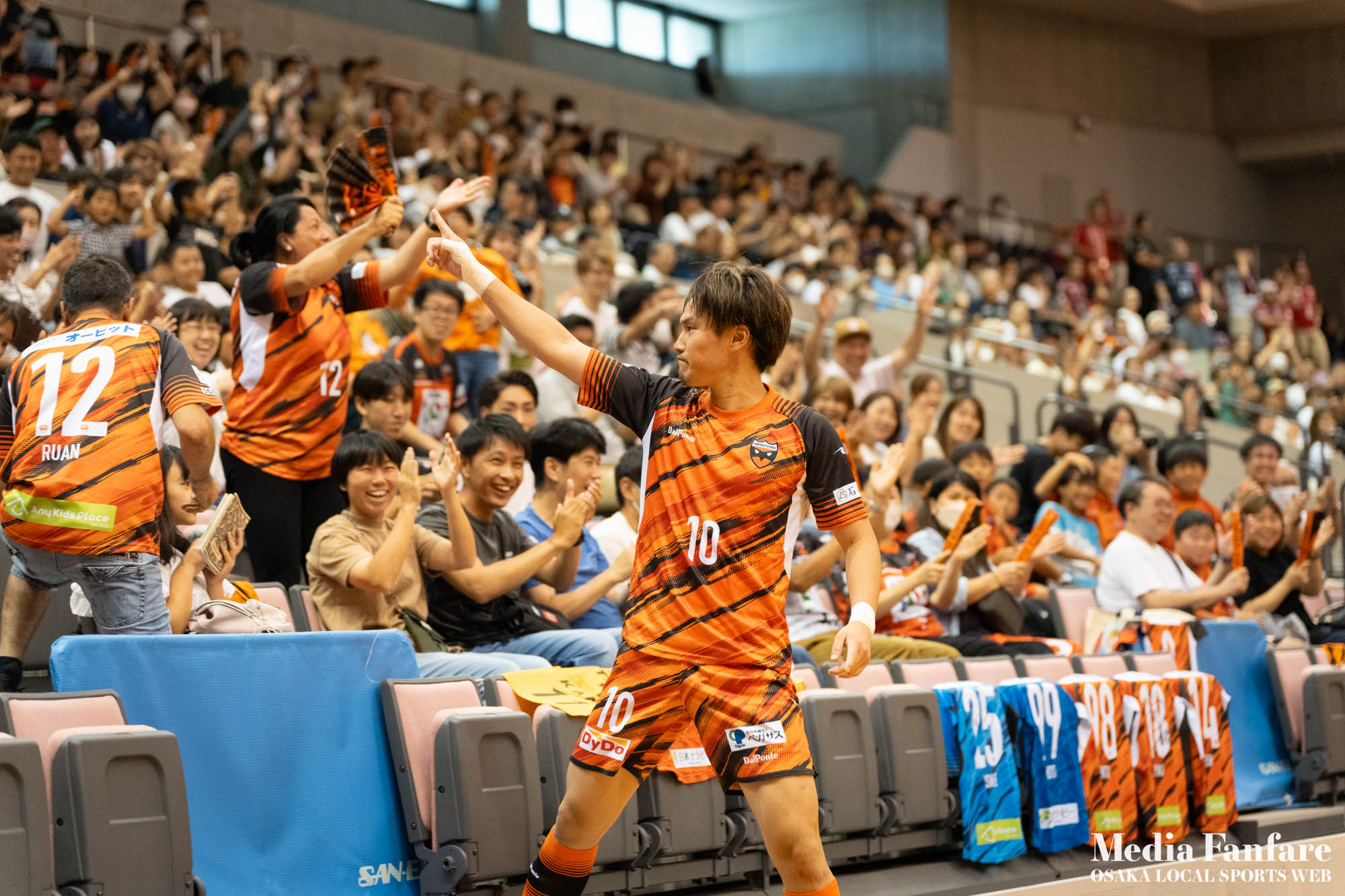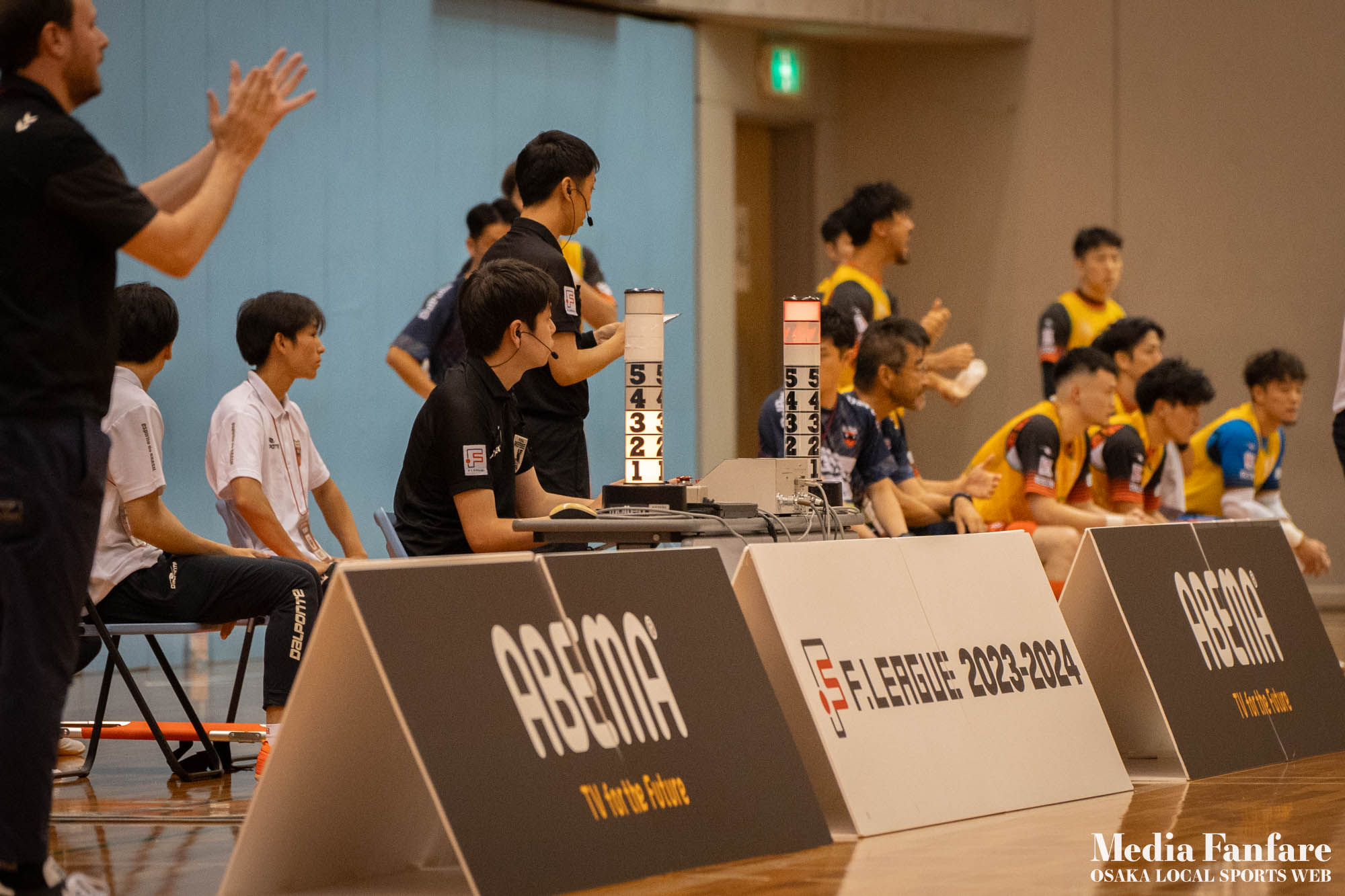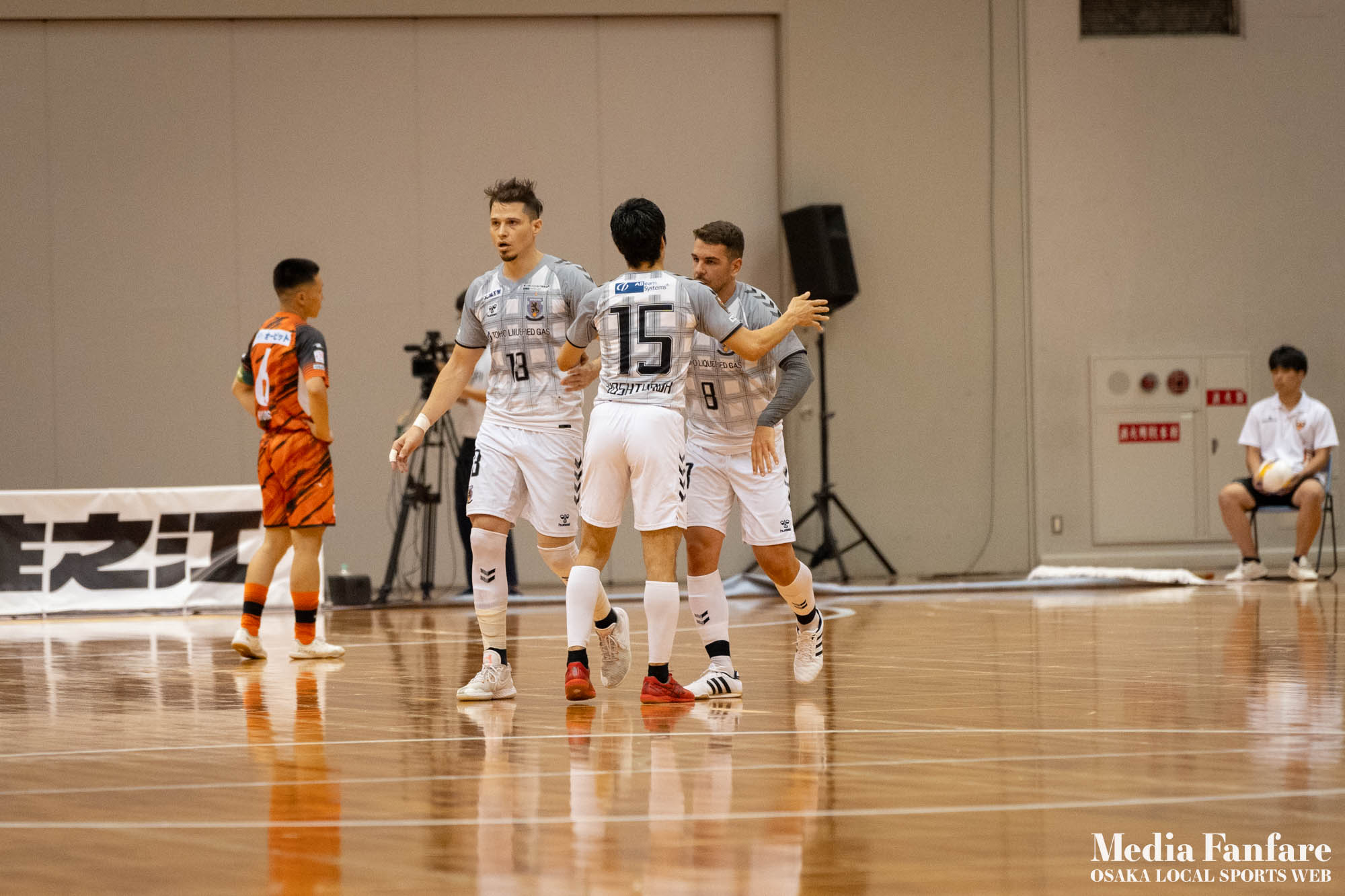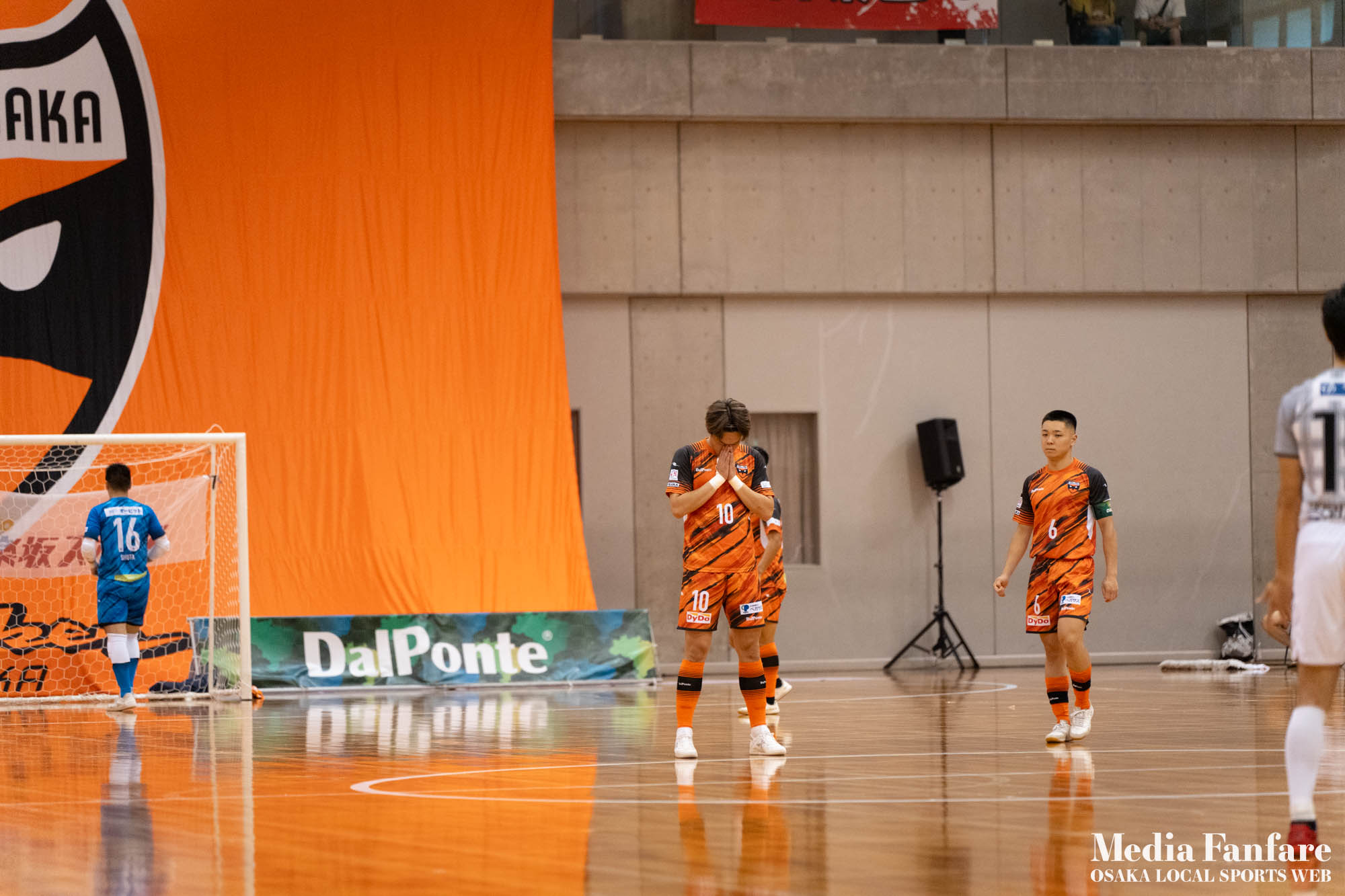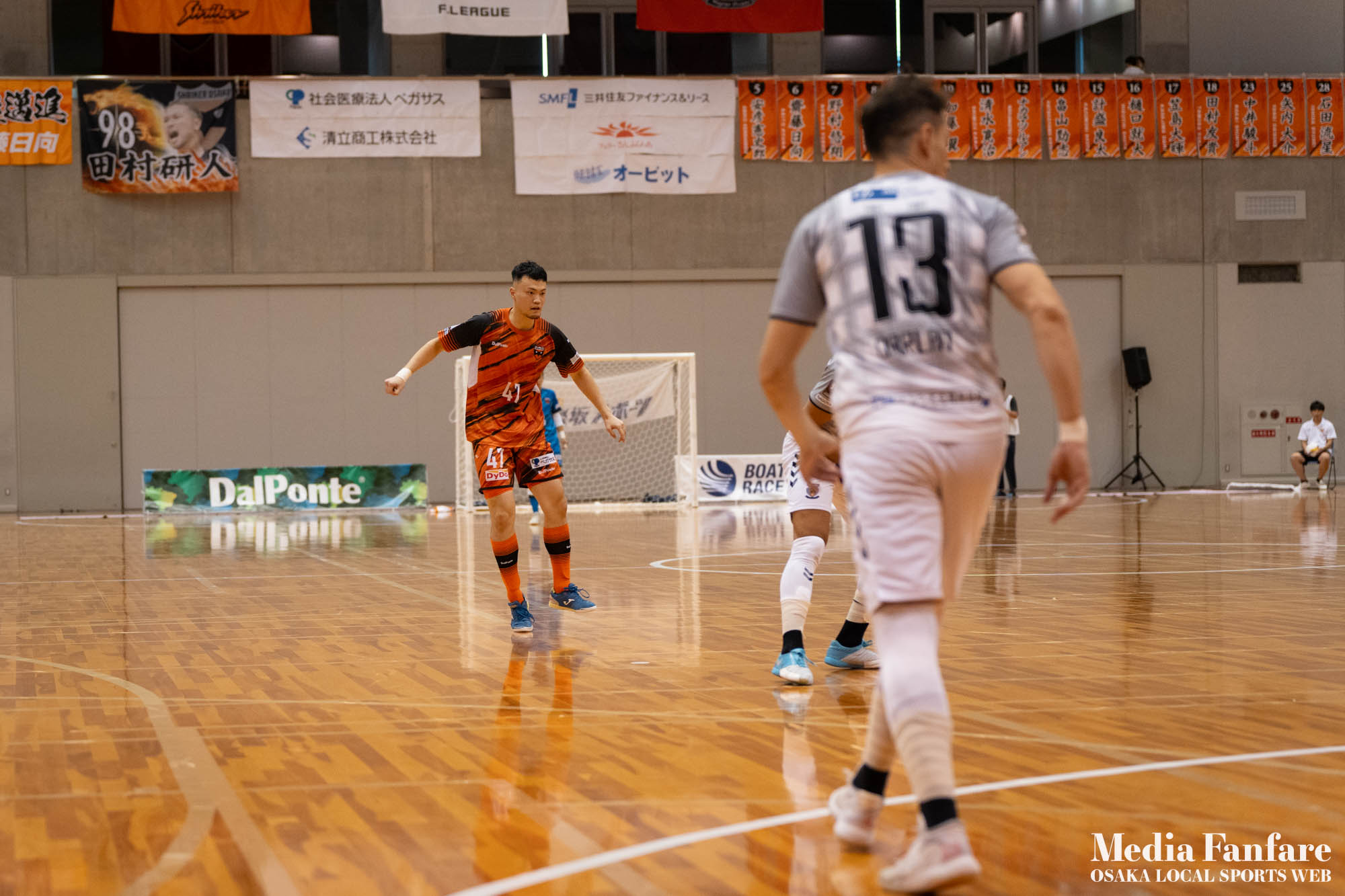 9月022023 [Fリーグ 第13節]まさに死闘!リベンジに燃える名古屋をホームで迎え撃つ(2023-24) シュライカー大阪 Contents1 名古屋が立て続けに2得点2 大阪が2点を返し、前半で試合を振り出しに戻す3 井口凛太朗選手の、強烈な逆転弾4 土壇場で見せた、王者の意地5 NEXT HOMEGAME6 PHOTO GALLERY 9/2(土)、岸和田市総合体育館にて、Fリーグ第13節 シュライカー大阪 vs 名古屋オーシャンズの試合が開催されました。Fリーグもいよいよ後半戦に突入。そろそろ順位の変動もこれまで以上に気にかかる時期になってきましたね。 対戦相手の名古屋オーシャンズは、開幕から13節までで負けたのは1試合のみ。その王者名古屋に唯一土をつけたのがシュライカー大阪。7月の第7節で、1-2でシュライカーがアウェー戦で勝利しています。名古屋としては、借りを返そうといつも以上に気合が入っているはず。同じ相手に連敗するのは、王者としてのプライドも許さないでしょう。一方シュライカー大阪も、リーグ後半も上位争いの中心に残り続けるためには名古屋に連勝して勢いに乗りたいところ。 スターティングメンバー、ベンチメンバーは以下の通り。 [スターティングメンバー] #6.齋藤 日向 (FP) #10.加藤 翼 (FP) #12.ナカマツ ルアン (FP) #98.田村 研人 (FP) #16.樋口 就大 (GK) [ベンチメンバー] #5.安彦 憲史郎 (FP) #7.野村 悠翔 (FP) #8.加藤 未渚実 (FP) #9.磯村 直樹 (FP) #11.清水 寛治 (FP) #14.畠山 勁志 (FP) #18.田村 友貴 (FP) #47.井口 凜太郎 (FP) #99.眞野 翔太 (GK) これまでベンチスタートが続いていた、加藤翼選手。重要な局面で得点を重ね、スターティングメンバー入り。 名古屋が立て続けに2得点 大阪が名古屋の攻撃を受けてカウンターを狙う展開を予想していたが、序盤は大阪が押し込み、立て続けにチャンスを作る。 しかし先制したのは名古屋オーシャンズ。前半6分にやや中途半端なクリアになったところを詰められ、自陣でボールを奪われてしまう。ポストプレーから右サイドを走りこんできたダルラン選手に決められ0-1。 さらに前半9分にも右サイドから強引に中へボールを放り込まれ、ゴール前にこぼれたボールを押し込まれて早い時間に追加点を奪われてしまう。大阪としてはディフェンスの枚数も足りており、守備が崩されたわけでもなくもったいない2失点。 大阪が2点を返し、前半で試合を振り出しに戻す なんとか早い時間帯に1点を返したいシュライカー大阪。前半14分、右からのコーナーキックをナカマツ ルアン選手が押し込み、1-2。 1点を返して勢いに乗る大阪、前半終了間際に見事なカウンターが炸裂。 自陣から齋藤日向、田村友樹、清水寛治と華麗なパスワークで相手陣内へ切り込み、右からのセンタリングを加藤翼選手が合わせて同点ゴール。大阪が前半のうちに試合を振り出しに戻します。 見事スタメン起用に答えた加藤翼選手。王者名古屋相手に2点先制され、なかなか厳しい状況というムードが漂っていた中、大阪の反撃に会場の空気も一転、歓喜に包まれます。 井口凛太朗選手の、強烈な逆転弾 大阪の反撃はまだ終わりません。大阪ボールで後半開始。最初のプレーでコーナーキックを獲得。 コーナーは中へは入れず、バックパスを選択。これを井口凛太朗選手が地を這うような強烈なミドルシュートを放ち、ゴールに突き刺さります。なんと2失点から3点返し、大阪が逆転。 身体を張って、好セーブを連発するGK樋口就大選手。後半開始早々の勝ち越し点だっただけに、残り時間はまだたっぷり。堅守の大阪といえ、攻撃力のある名古屋相手に1点のリードを守り切るのは至難の業。 追加点が欲しい大阪。磯村直樹選手がGKと1対1で追加点のチャンスを作るも、惜しくもゴールにはならず。 土壇場で見せた、王者の意地 逆転を許した名古屋オーシャンズ、このままでは終われないとプレーの激しさも増します。 名古屋はこの日、2枚目のイエローカード。大阪もファウルが5つたまり、次からのファウルは第2PKを取られてしまうため、強いコンタクトは避けないといけない状況。両チーム身体を張った手に汗握る攻防戦に目が離せません。 後半36分まで1点のリードを死守し続けたシュライカー大阪。「このまま逃げ切れるかも・・・」と、名古屋に連勝という快挙が頭をよぎった頃、さらに試合が動きます。 パワープレーで猛攻を仕掛ける名古屋が得点ランクトップを走るアンドレシート選手のゴールでついに同点。土壇場で追いつき、王者の意地を見せた名古屋オーシャンズ。 残り時間は、双方めまぐるしいパワープレーの応酬。4色のユニフォームが密集するのもフットサルならではの光景。 最後の最後までどうなるのか分からない試合でしたが、前半2点ずつ、後半は1点ずつを取り合い3-3のまま試合終了。一瞬たりとも目が離せないスリリングな展開が続き、フットサルの醍醐味が詰まった素晴らしい試合でした。 NEXT HOMEGAME 名古屋戦のあと、第14節のエスポラーダ北海道とのアウェー戦も2-2で引き分け。シュライカー大阪は勝点23で5位をキ