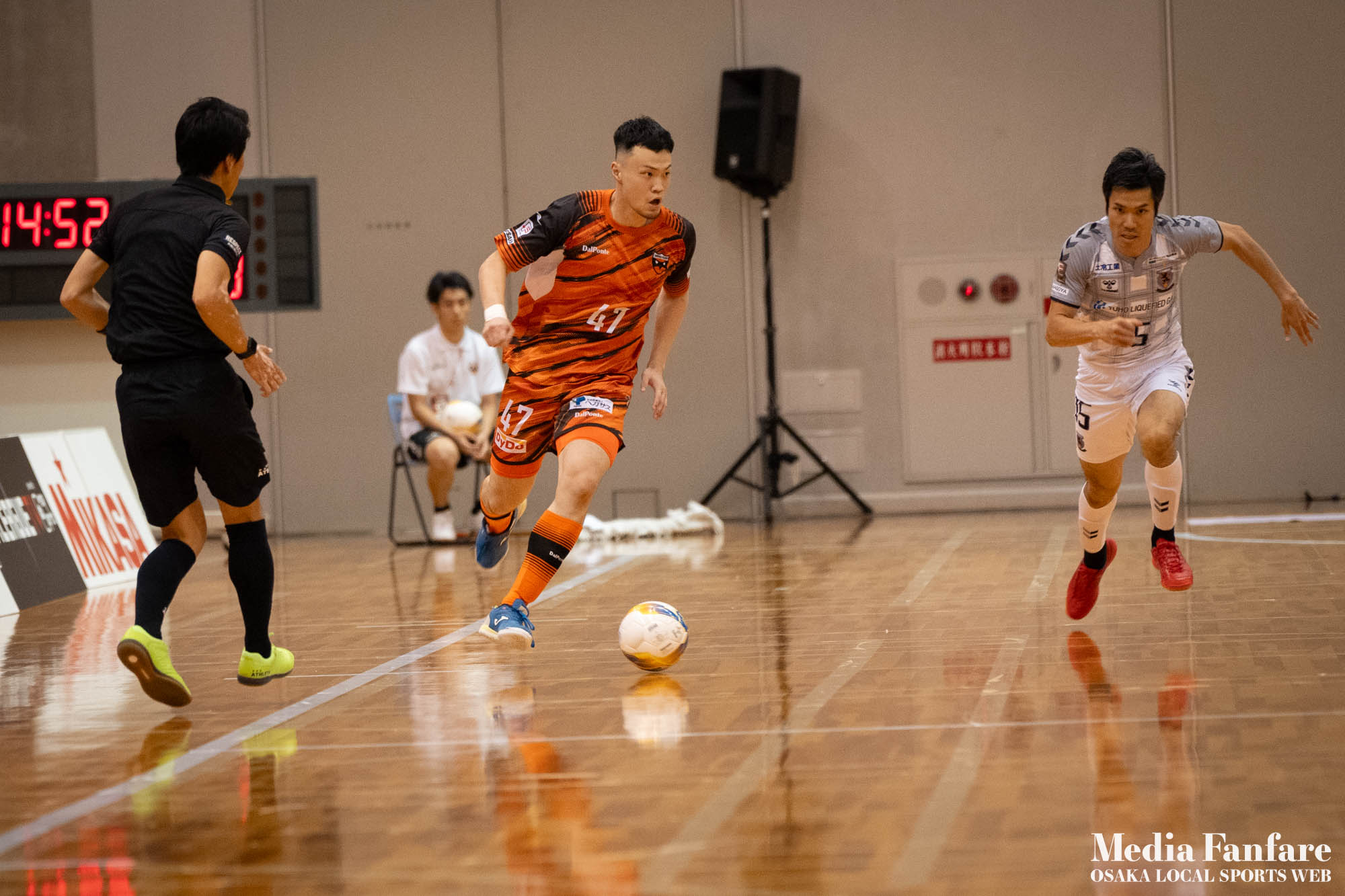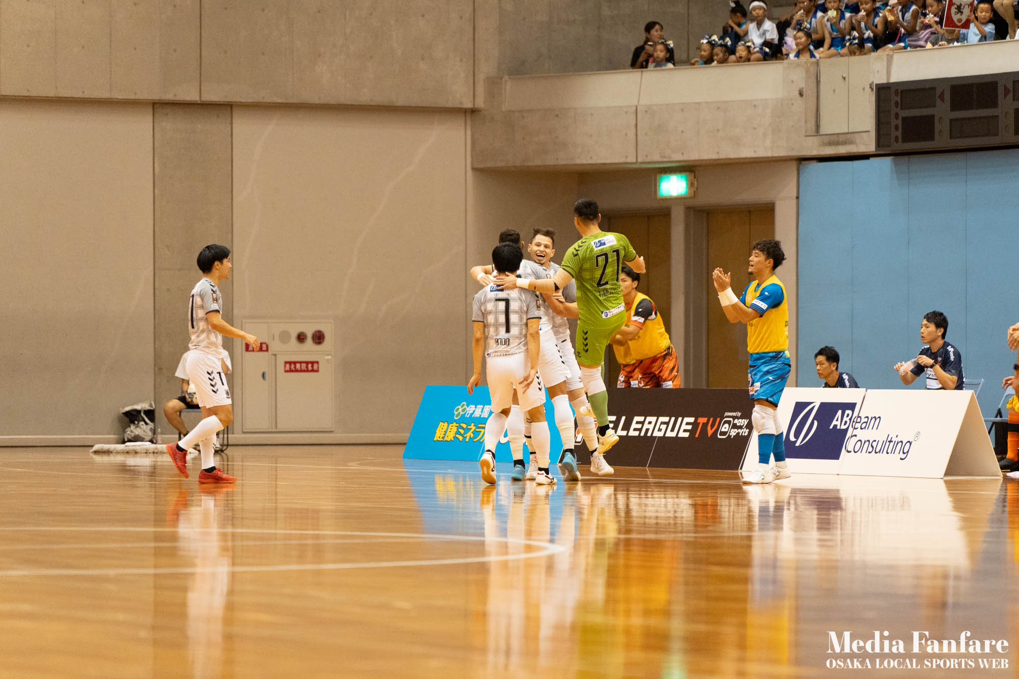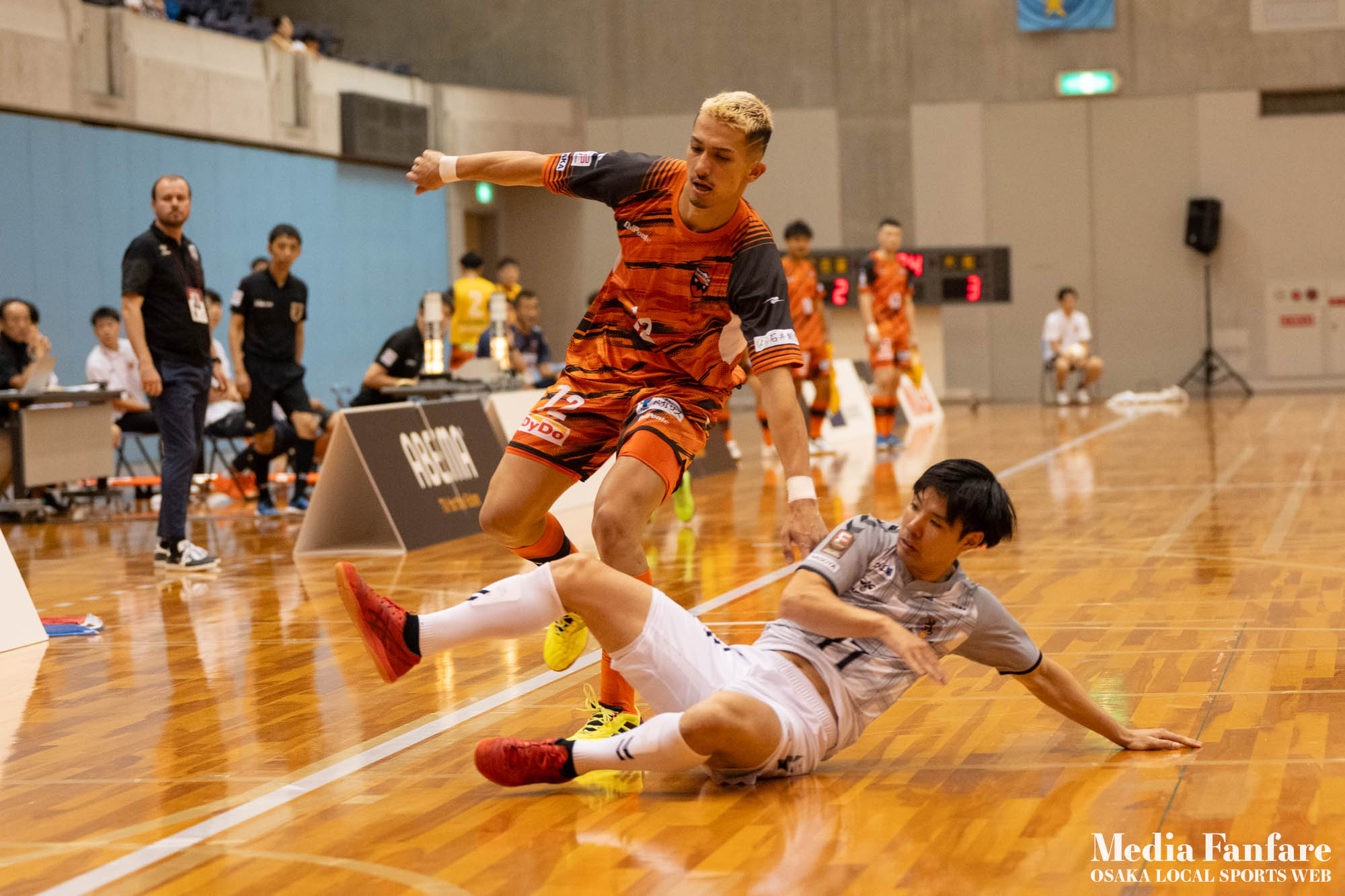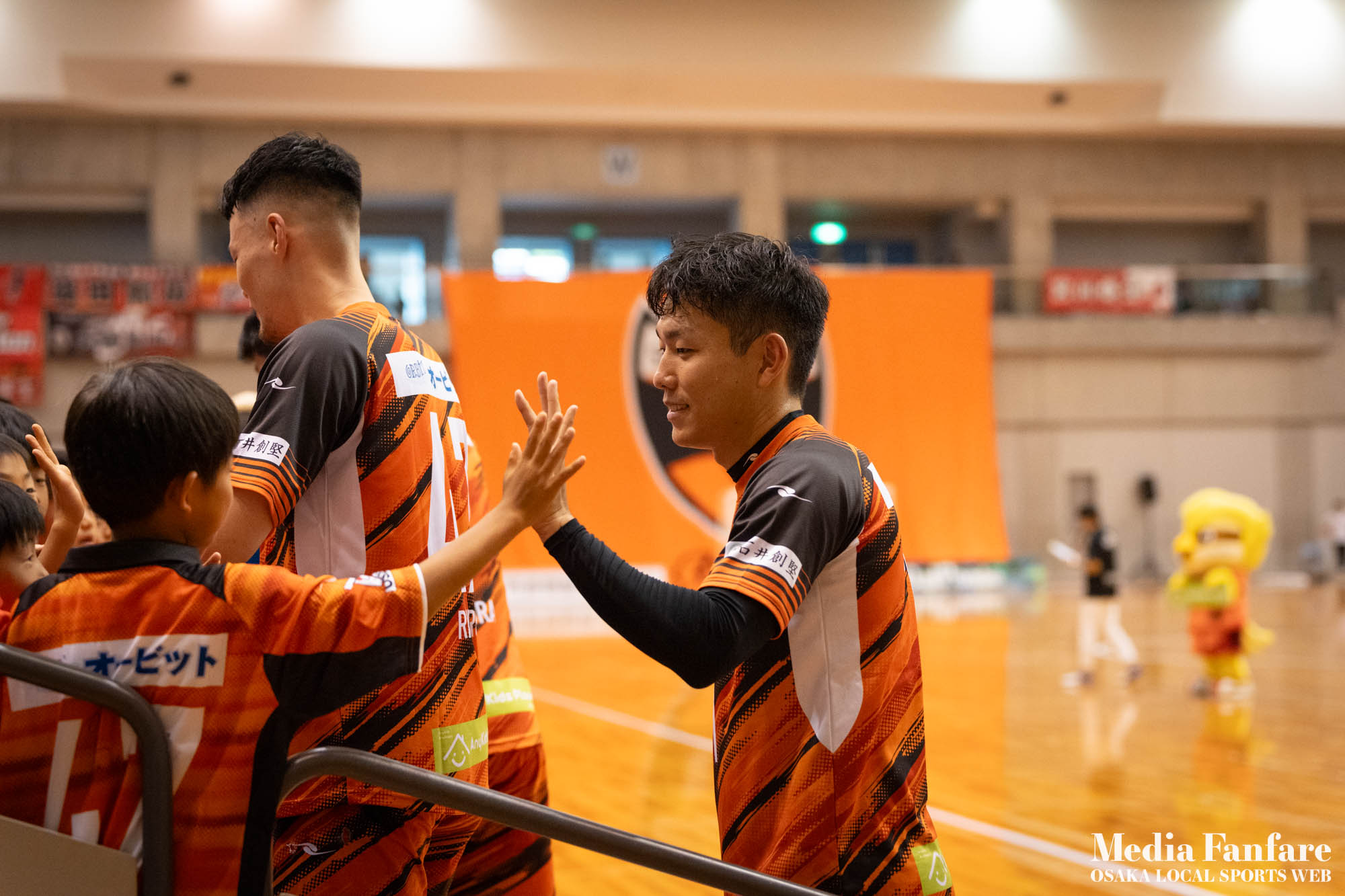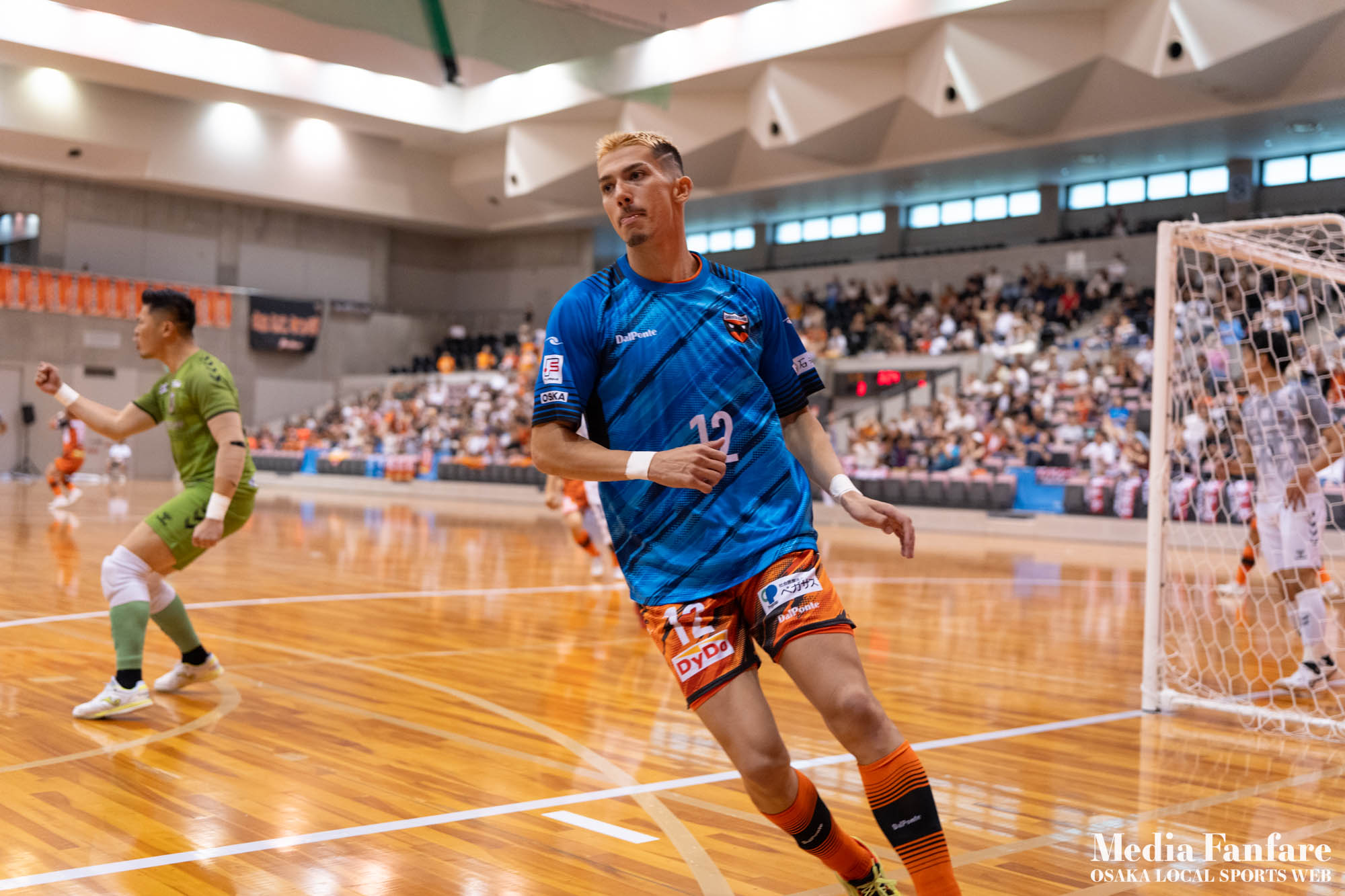 9月022023 [Fリーグ 第13節]まさに死闘!リベンジに燃える名古屋をホームで迎え撃つ(2023-24) シュライカー大阪 Contents1 名古屋が立て続けに2得点2 大阪が2点を返し、前半で試合を振り出しに戻す3 井口凛太朗選手の、強烈な逆転弾4 土壇場で見せた、王者の意地5 NEXT HOMEGAME6 PHOTO GALLERY 9/2(土)、岸和田市総合体育館にて、Fリーグ第13節 シュライカー大阪 vs 名古屋オーシャンズの試合が開催されました。Fリーグもいよいよ後半戦に突入。そろそろ順位の変動もこれまで以上に気にかかる時期になってきましたね。 対戦相手の名古屋オーシャンズは、開幕から13節までで負けたのは1試合のみ。その王者名古屋に唯一土をつけたのがシュライカー大阪。7月の第7節で、1-2でシュライカーがアウェー戦で勝利しています。名古屋としては、借りを返そうといつも以上に気合が入っているはず。同じ相手に連敗するのは、王者としてのプライドも許さないでしょう。一方シュライカー大阪も、リーグ後半も上位争いの中心に残り続けるためには名古屋に連勝して勢いに乗りたいところ。 スターティングメンバー、ベンチメンバーは以下の通り。 [スターティングメンバー] #6.齋藤 日向 (FP) #10.加藤 翼 (FP) #12.ナカマツ ルアン (FP) #98.田村 研人 (FP) #16.樋口 就大 (GK) [ベンチメンバー] #5.安彦 憲史郎 (FP) #7.野村 悠翔 (FP) #8.加藤 未渚実 (FP) #9.磯村 直樹 (FP) #11.清水 寛治 (FP) #14.畠山 勁志 (FP) #18.田村 友貴 (FP) #47.井口 凜太郎 (FP) #99.眞野 翔太 (GK) これまでベンチスタートが続いていた、加藤翼選手。重要な局面で得点を重ね、スターティングメンバー入り。 名古屋が立て続けに2得点 大阪が名古屋の攻撃を受けてカウンターを狙う展開を予想していたが、序盤は大阪が押し込み、立て続けにチャンスを作る。 しかし先制したのは名古屋オーシャンズ。前半6分にやや中途半端なクリアになったところを詰められ、自陣でボールを奪われてしまう。ポストプレーから右サイドを走りこんできたダルラン選手に決められ0-1。 さらに前半9分にも右サイドから強引に中へボールを放り込まれ、ゴール前にこぼれたボールを押し込まれて早い時間に追加点を奪われてしまう。大阪としてはディフェンスの枚数も足りており、守備が崩されたわけでもなくもったいない2失点。 大阪が2点を返し、前半で試合を振り出しに戻す なんとか早い時間帯に1点を返したいシュライカー大阪。前半14分、右からのコーナーキックをナカマツ ルアン選手が押し込み、1-2。 1点を返して勢いに乗る大阪、前半終了間際に見事なカウンターが炸裂。 自陣から齋藤日向、田村友樹、清水寛治と華麗なパスワークで相手陣内へ切り込み、右からのセンタリングを加藤翼選手が合わせて同点ゴール。大阪が前半のうちに試合を振り出しに戻します。 見事スタメン起用に答えた加藤翼選手。王者名古屋相手に2点先制され、なかなか厳しい状況というムードが漂っていた中、大阪の反撃に会場の空気も一転、歓喜に包まれます。 井口凛太朗選手の、強烈な逆転弾 大阪の反撃はまだ終わりません。大阪ボールで後半開始。最初のプレーでコーナーキックを獲得。 コーナーは中へは入れず、バックパスを選択。これを井口凛太朗選手が地を這うような強烈なミドルシュートを放ち、ゴールに突き刺さります。なんと2失点から3点返し、大阪が逆転。 身体を張って、好セーブを連発するGK樋口就大選手。後半開始早々の勝ち越し点だっただけに、残り時間はまだたっぷり。堅守の大阪といえ、攻撃力のある名古屋相手に1点のリードを守り切るのは至難の業。 追加点が欲しい大阪。磯村直樹選手がGKと1対1で追加点のチャンスを作るも、惜しくもゴールにはならず。 土壇場で見せた、王者の意地 逆転を許した名古屋オーシャンズ、このままでは終われないとプレーの激しさも増します。 名古屋はこの日、2枚目のイエローカード。大阪もファウルが5つたまり、次からのファウルは第2PKを取られてしまうため、強いコンタクトは避けないといけない状況。両チーム身体を張った手に汗握る攻防戦に目が離せません。 後半36分まで1点のリードを死守し続けたシュライカー大阪。「このまま逃げ切れるかも・・・」と、名古屋に連勝という快挙が頭をよぎった頃、さらに試合が動きます。 パワープレーで猛攻を仕掛ける名古屋が得点ランクトップを走るアンドレシート選手のゴールでついに同点。土壇場で追いつき、王者の意地を見せた名古屋オーシャンズ。 残り時間は、双方めまぐるしいパワープレーの応酬。4色のユニフォームが密集するのもフットサルならではの光景。 最後の最後までどうなるのか分からない試合でしたが、前半2点ずつ、後半は1点ずつを取り合い3-3のまま試合終了。一瞬たりとも目が離せないスリリングな展開が続き、フットサルの醍醐味が詰まった素晴らしい試合でした。 NEXT HOMEGAME 名古屋戦のあと、第14節のエスポラーダ北海道とのアウェー戦も2-2で引き分け。シュライカー大阪は勝点23で5位をキ