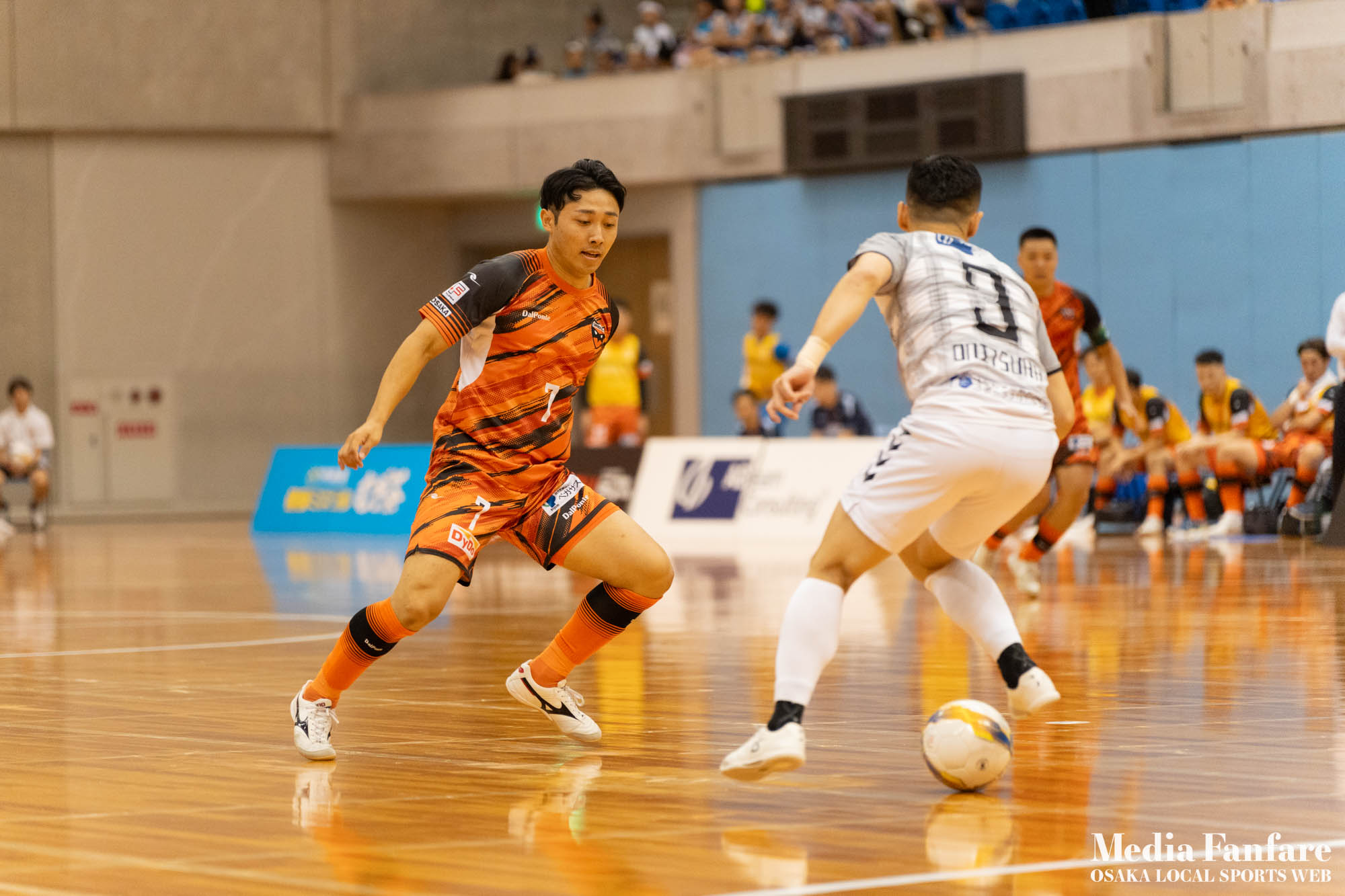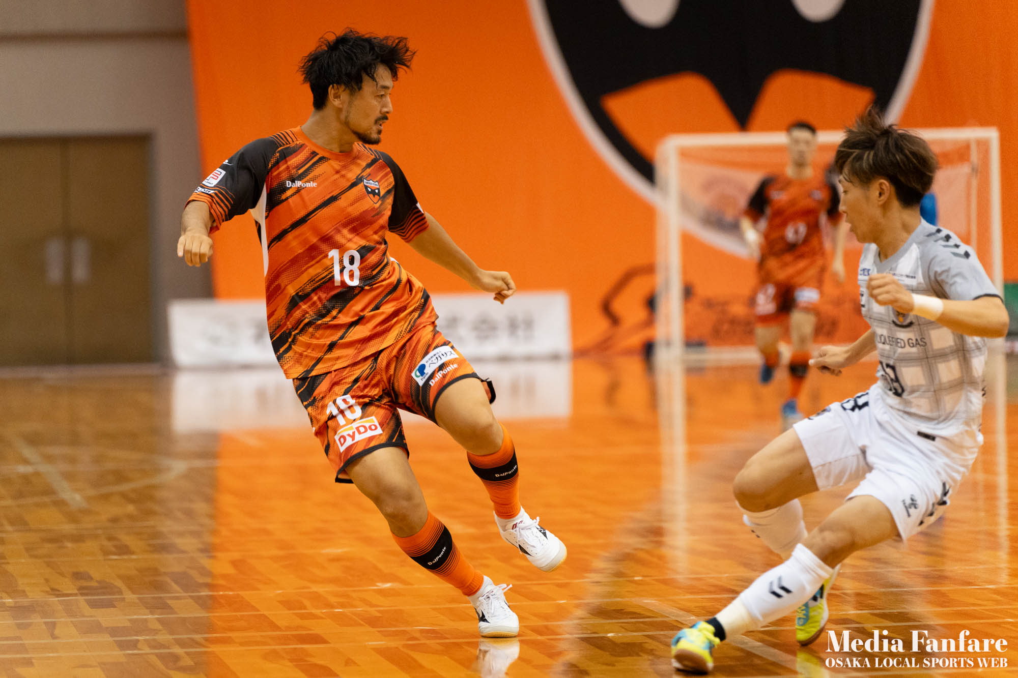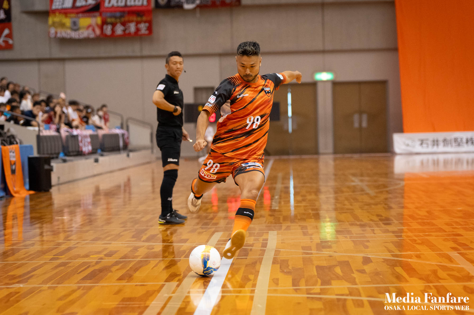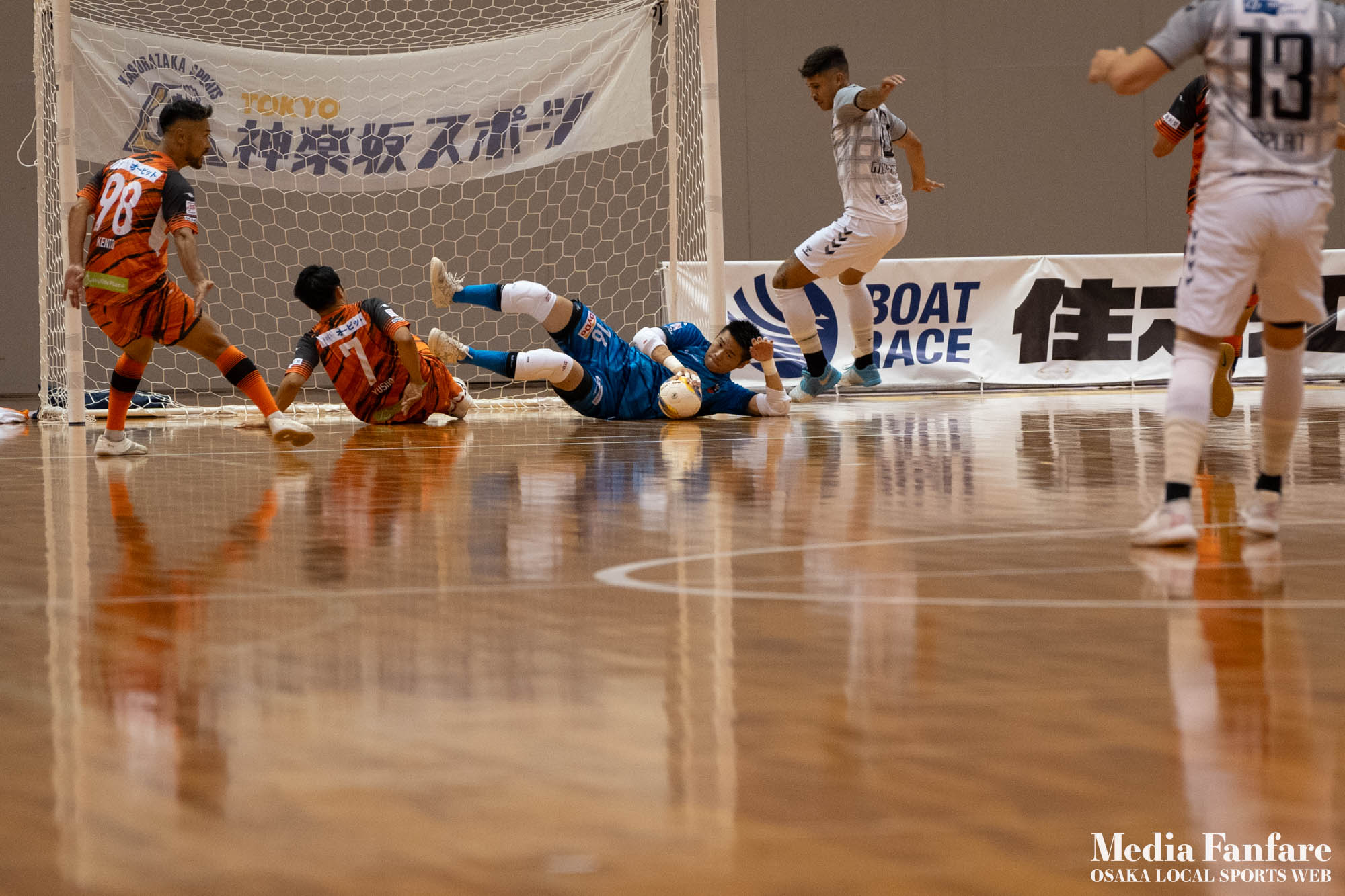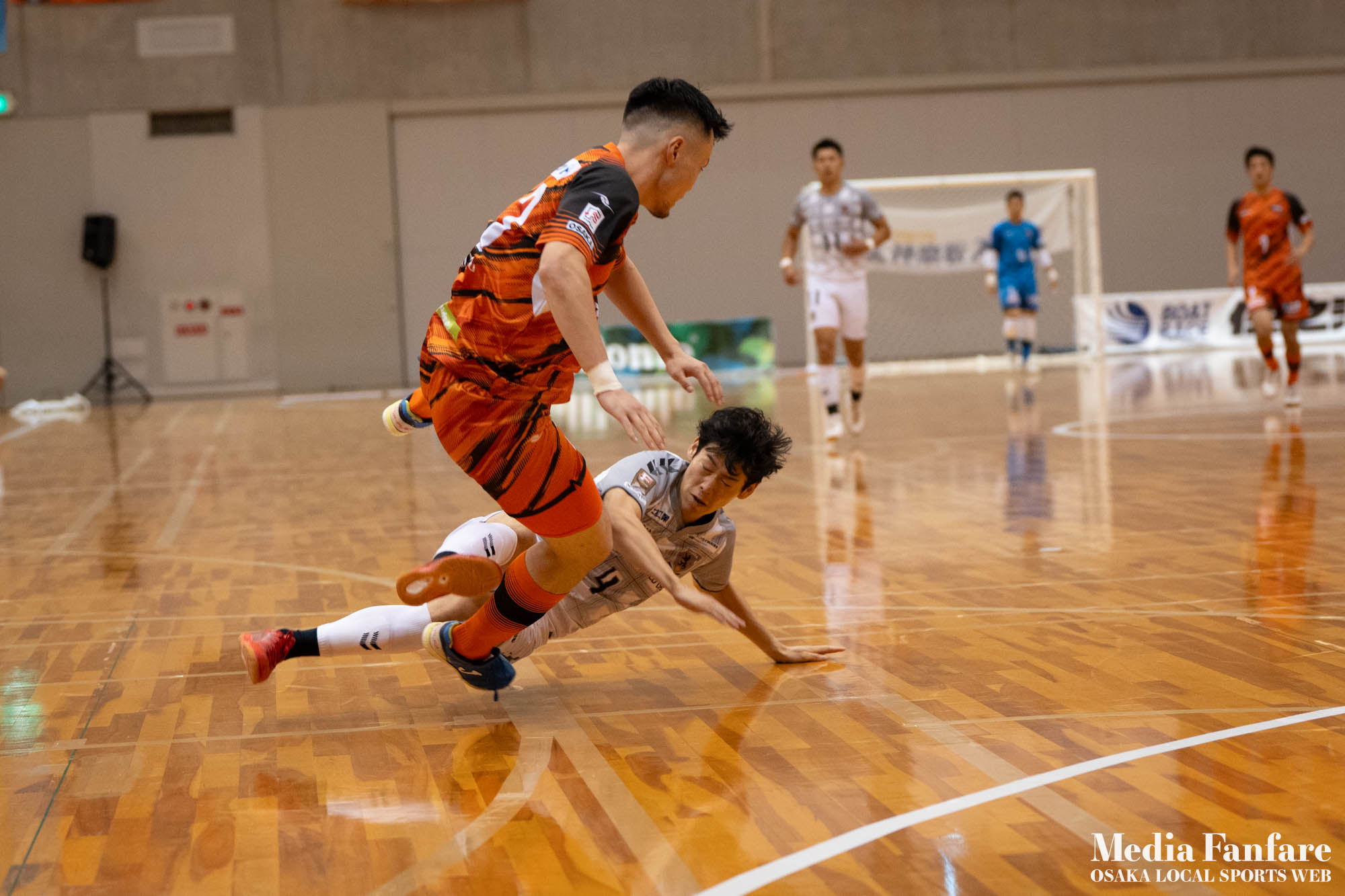9月022023 [Fリーグ 第13節]まさに死闘!リベンジに燃える名古屋をホームで迎え撃つ(2023-24) シュライカー大阪 Contents1 名古屋が立て続けに2得点2 大阪が2点を返し、前半で試合を振り出しに戻す3 井口凛太朗選手の、強烈な逆転弾4 土壇場で見せた、王者の意地5 NEXT HOMEGAME6 PHOTO GALLERY 9/2(土)、岸和田市総合体育館にて、Fリーグ第13節 シュライカー大阪 vs 名古屋オーシャンズの試合が開催されました。Fリーグもいよいよ後半戦に突入。そろそろ順位の変動もこれまで以上に気にかかる時期になってきましたね。 対戦相手の名古屋オーシャンズは、開幕から13節までで負けたのは1試合のみ。その王者名古屋に唯一土をつけたのがシュライカー大阪。7月の第7節で、1-2でシュライカーがアウェー戦で勝利しています。名古屋としては、借りを返そうといつも以上に気合が入っているはず。同じ相手に連敗するのは、王者としてのプライドも許さないでしょう。一方シュライカー大阪も、リーグ後半も上位争いの中心に残り続けるためには名古屋に連勝して勢いに乗りたいところ。 スターティングメンバー、ベンチメンバーは以下の通り。 [スターティングメンバー] #6.齋藤 日向 (FP) #10.加藤 翼 (FP) #12.ナカマツ ルアン (FP) #98.田村 研人 (FP) #16.樋口 就大 (GK) [ベンチメンバー] #5.安彦 憲史郎 (FP) #7.野村 悠翔 (FP) #8.加藤 未渚実 (FP) #9.磯村 直樹 (FP) #11.清水 寛治 (FP) #14.畠山 勁志 (FP) #18.田村 友貴 (FP) #47.井口 凜太郎 (FP) #99.眞野 翔太 (GK) これまでベンチスタートが続いていた、加藤翼選手。重要な局面で得点を重ね、スターティングメンバー入り。 名古屋が立て続けに2得点 大阪が名古屋の攻撃を受けてカウンターを狙う展開を予想していたが、序盤は大阪が押し込み、立て続けにチャンスを作る。 しかし先制したのは名古屋オーシャンズ。前半6分にやや中途半端なクリアになったところを詰められ、自陣でボールを奪われてしまう。ポストプレーから右サイドを走りこんできたダルラン選手に決められ0-1。 さらに前半9分にも右サイドから強引に中へボールを放り込まれ、ゴール前にこぼれたボールを押し込まれて早い時間に追加点を奪われてしまう。大阪としてはディフェンスの枚数も足りており、守備が崩されたわけでもなくもったいない2失点。 大阪が2点を返し、前半で試合を振り出しに戻す なんとか早い時間帯に1点を返したいシュライカー大阪。前半14分、右からのコーナーキックをナカマツ ルアン選手が押し込み、1-2。 1点を返して勢いに乗る大阪、前半終了間際に見事なカウンターが炸裂。 自陣から齋藤日向、田村友樹、清水寛治と華麗なパスワークで相手陣内へ切り込み、右からのセンタリングを加藤翼選手が合わせて同点ゴール。大阪が前半のうちに試合を振り出しに戻します。 見事スタメン起用に答えた加藤翼選手。王者名古屋相手に2点先制され、なかなか厳しい状況というムードが漂っていた中、大阪の反撃に会場の空気も一転、歓喜に包まれます。 井口凛太朗選手の、強烈な逆転弾 大阪の反撃はまだ終わりません。大阪ボールで後半開始。最初のプレーでコーナーキックを獲得。 コーナーは中へは入れず、バックパスを選択。これを井口凛太朗選手が地を這うような強烈なミドルシュートを放ち、ゴールに突き刺さります。なんと2失点から3点返し、大阪が逆転。 身体を張って、好セーブを連発するGK樋口就大選手。後半開始早々の勝ち越し点だっただけに、残り時間はまだたっぷり。堅守の大阪といえ、攻撃力のある名古屋相手に1点のリードを守り切るのは至難の業。 追加点が欲しい大阪。磯村直樹選手がGKと1対1で追加点のチャンスを作るも、惜しくもゴールにはならず。 土壇場で見せた、王者の意地 逆転を許した名古屋オーシャンズ、このままでは終われないとプレーの激しさも増します。 名古屋はこの日、2枚目のイエローカード。大阪もファウルが5つたまり、次からのファウルは第2PKを取られてしまうため、強いコンタクトは避けないといけない状況。両チーム身体を張った手に汗握る攻防戦に目が離せません。 後半36分まで1点のリードを死守し続けたシュライカー大阪。「このまま逃げ切れるかも・・・」と、名古屋に連勝という快挙が頭をよぎった頃、さらに試合が動きます。 パワープレーで猛攻を仕掛ける名古屋が得点ランクトップを走るアンドレシート選手のゴールでついに同点。土壇場で追いつき、王者の意地を見せた名古屋オーシャンズ。 残り時間は、双方めまぐるしいパワープレーの応酬。4色のユニフォームが密集するのもフットサルならではの光景。 最後の最後までどうなるのか分からない試合でしたが、前半2点ずつ、後半は1点ずつを取り合い3-3のまま試合終了。一瞬たりとも目が離せないスリリングな展開が続き、フットサルの醍醐味が詰まった素晴らしい試合でした。 NEXT HOMEGAME 名古屋戦のあと、第14節のエスポラーダ北海道とのアウェー戦も2-2で引き分け。シュライカー大阪は勝点23で5位をキ