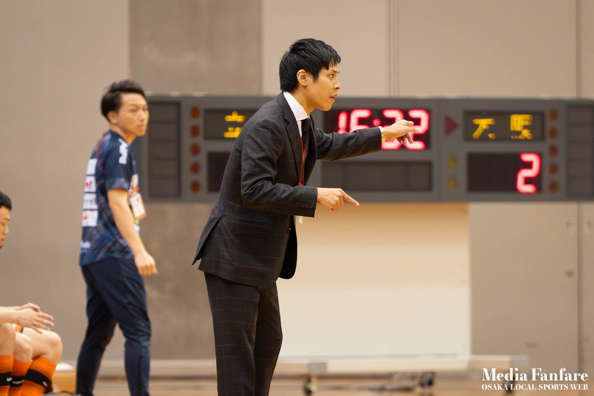 全身を使ってベンチから指示を出す、シュライカー大阪の永井義文監督と立川アスレティックFCの比嘉リカルド監督。熱く激しい両指揮官にも注目が集まる一戦。