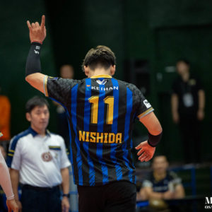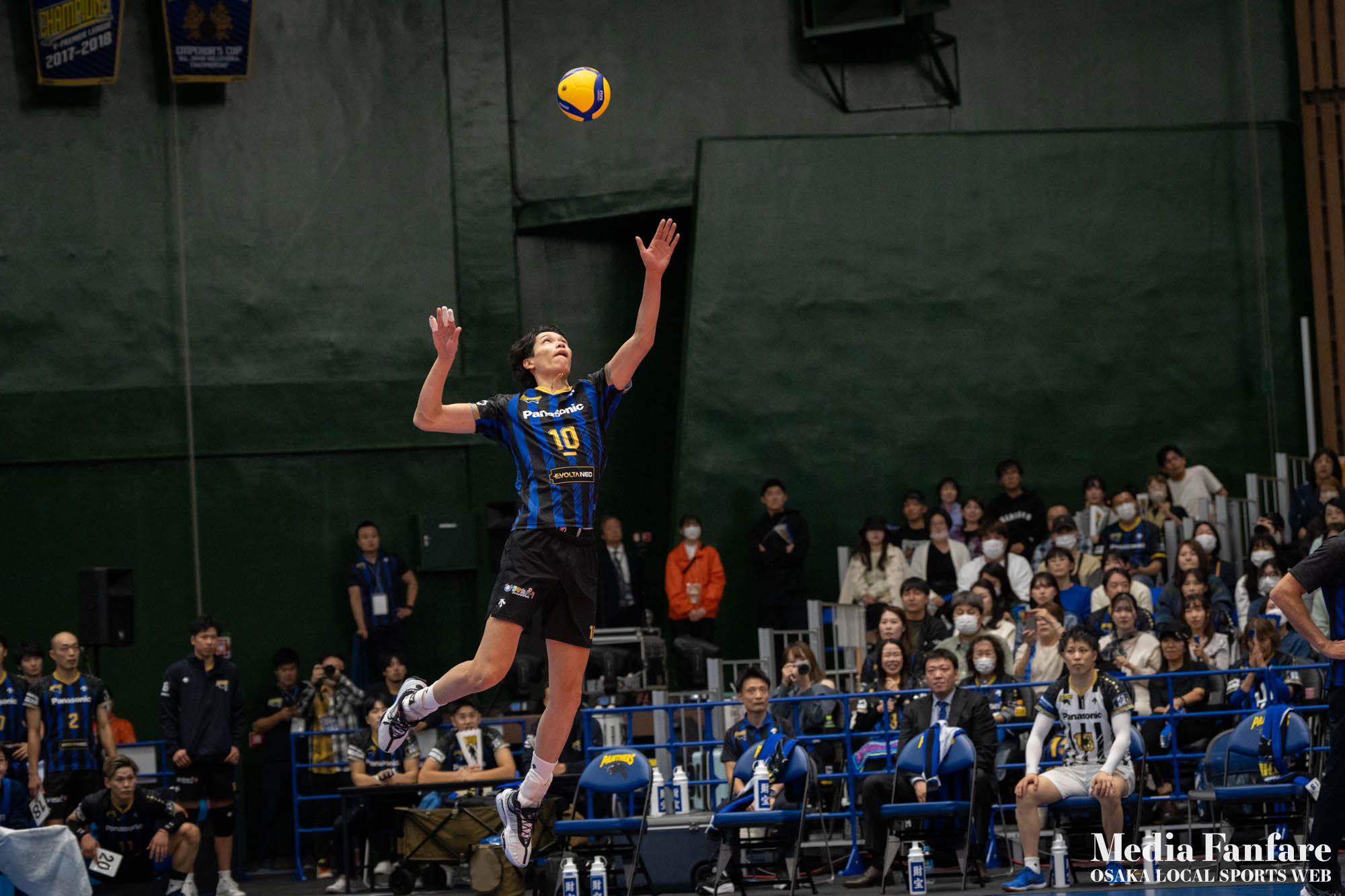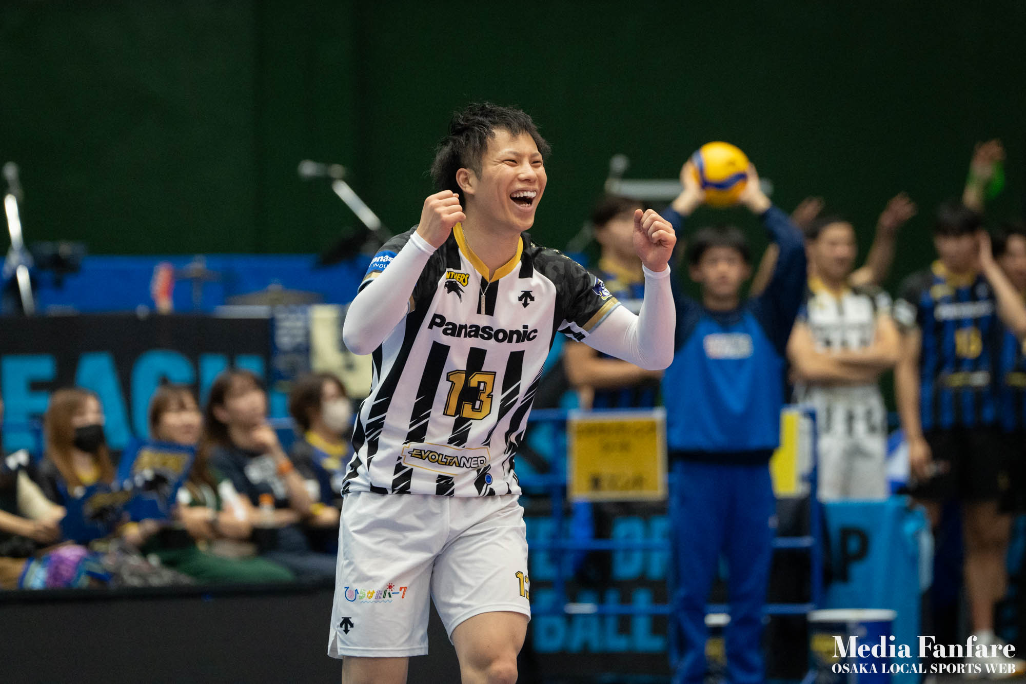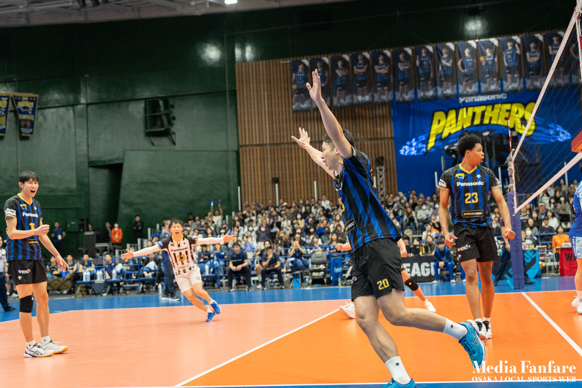 24-16とパナソニックが大きくリードしたままセットポイントを迎え、最後は西田がアタックを決めセットを連取。