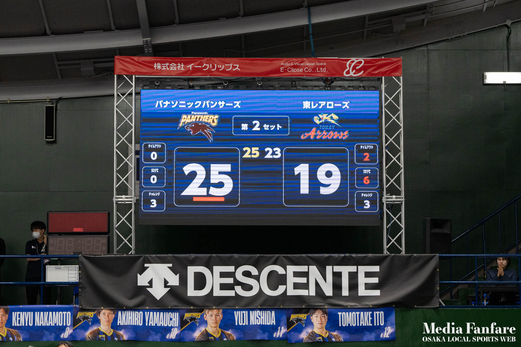 大塚、西田、ジェスキーのアタックで後がない東レの猛追を振り切って、3点のリードを守りきったパンサーズが25-22でセットを取り試合終了。シーズン初のホームゲームを勝利で飾った。